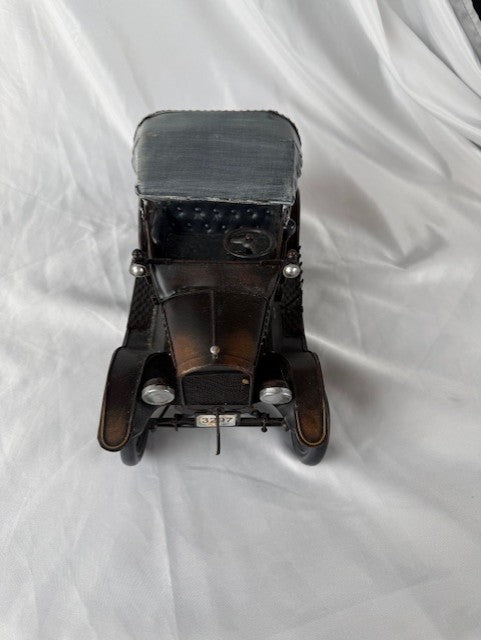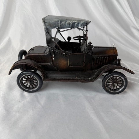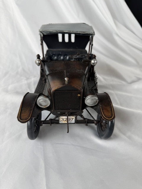 The 1920s Ford Model T Tin Lizzie automotive model is completely hand-built & handcrafted of metal with a metal frame. The spare tire, head lamps, jack and horn are welded into position (no parts are glued on). The wheels roll.