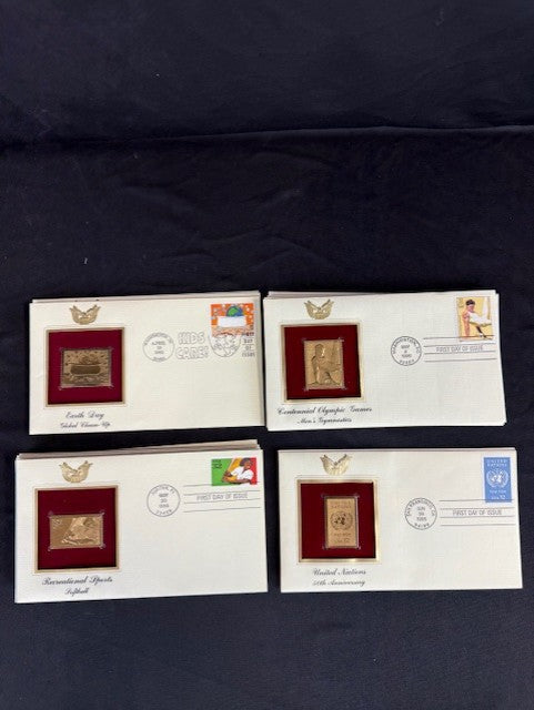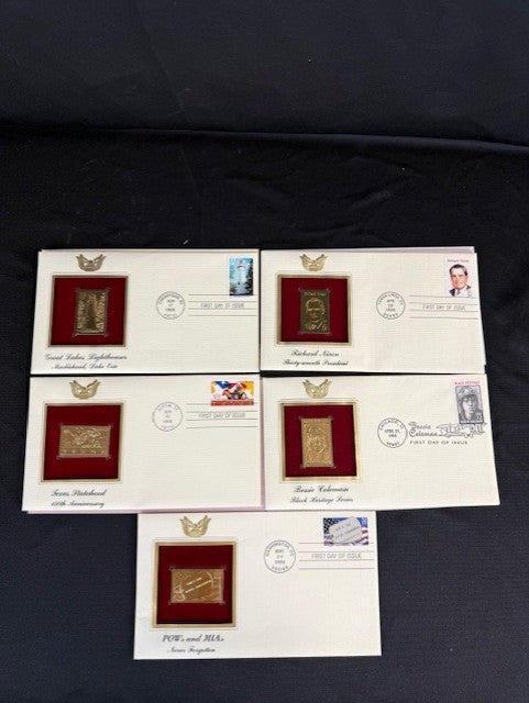 Set of 17 first day of issue stamp replicas. Included in the lot: Bessie Coleman, Marblehead Lake Eerie, Earth Day: Solar Energy, Men's Basketball, Golf, Volleyball, Richard Nixon, Texas Statehood, and others. All in excellent condition, some with accompanying paperwork.