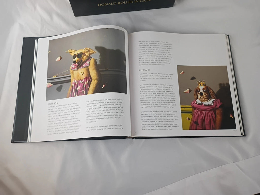 A Strong Night Wind is a 1995 art book by Donald Roller Wilson, featuring over 100 of his paintings, primarily of sentient animals, accompanied by his commentary and that of the "sitters" themselves. The lavish monograph includes an introduction by Carrie Fisher and comments from Robin Williams, showcasing Wilson's eccentric style and extensive body of work from 1974-1995. Book is in excellent condition and comes with original hard case slip cover. See photos.