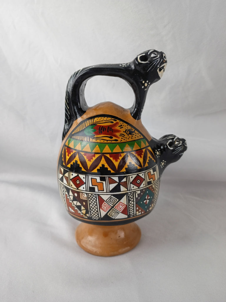 Gorgeous handmade peruvian art pottery piece. Traditional geometric designs with Jaguar figures. Measures 4"L x 3"W x 7"H. In excellent condition.