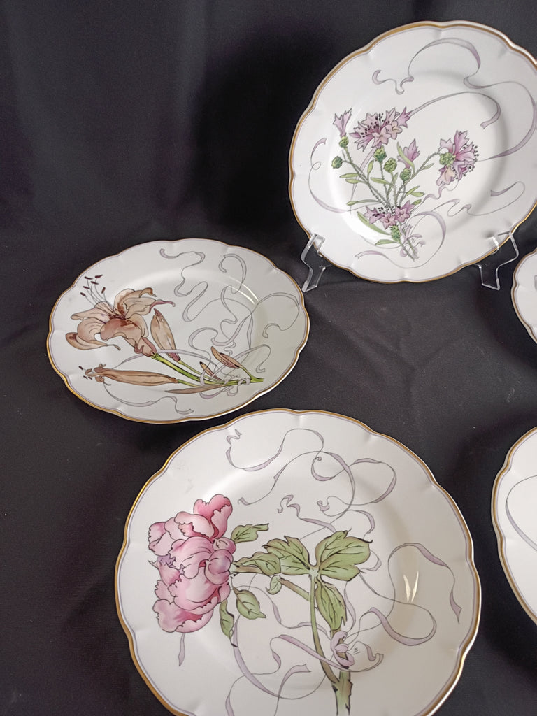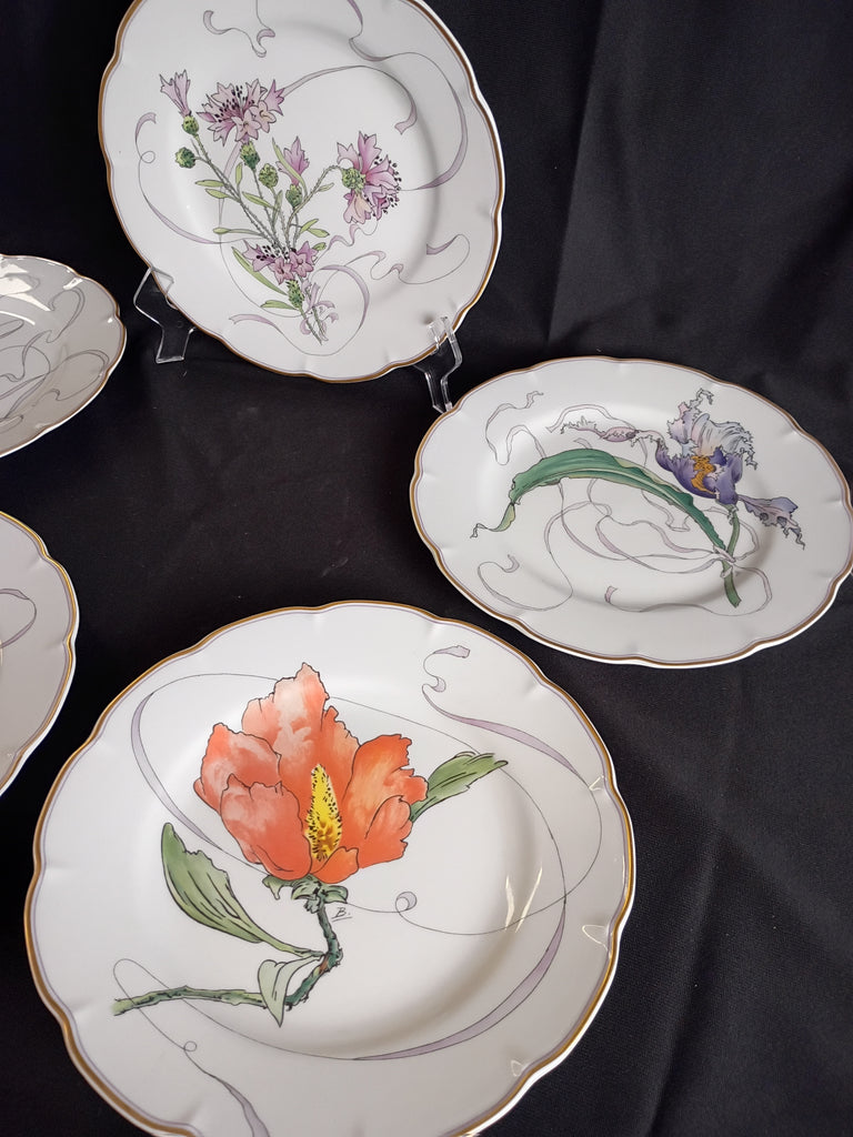 Haviland Limoges Fleurs et Rubans Plates . Set of 5 plates. Included in the set is: Wild Garlic, Peony, Hibiscus, Orchid, and Lily. Each plate measures 10". All in great condition.