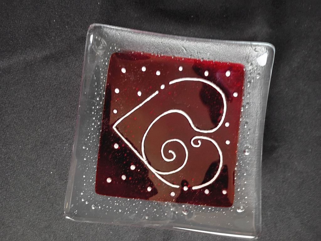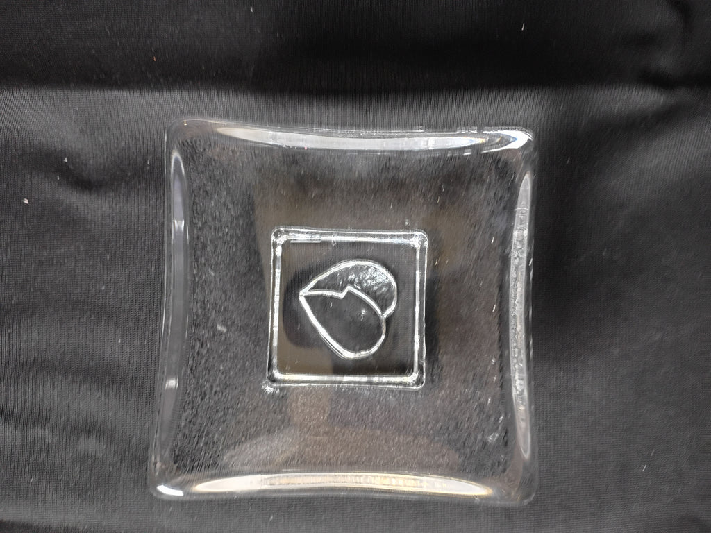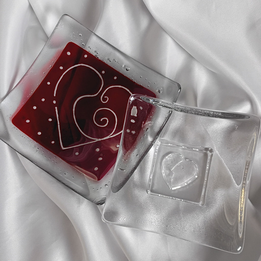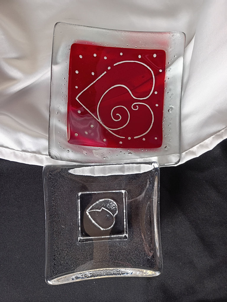 Set of two abstract heart dishes. One is clear and has the profile of a person as half of the heart design in the middle, the other is clear with a red and white heart design in the middle. The fully clear one measures 4"W x 2"H and the other is 5.5"W x 1"H. Both in great condition.