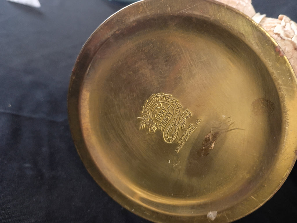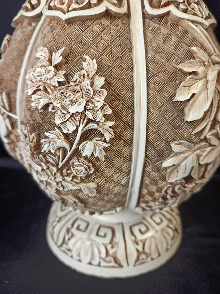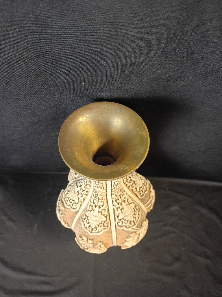 Ornate Carved Ivory vase with brass base by Ivory Dynasty. Vintage, from Arnart Imports. Intricate floral pattern on an hourglass form. Elegant and timeless appeal. Measures 6"L x 4.5"W x 13"H.