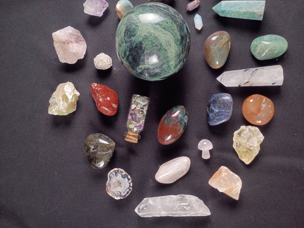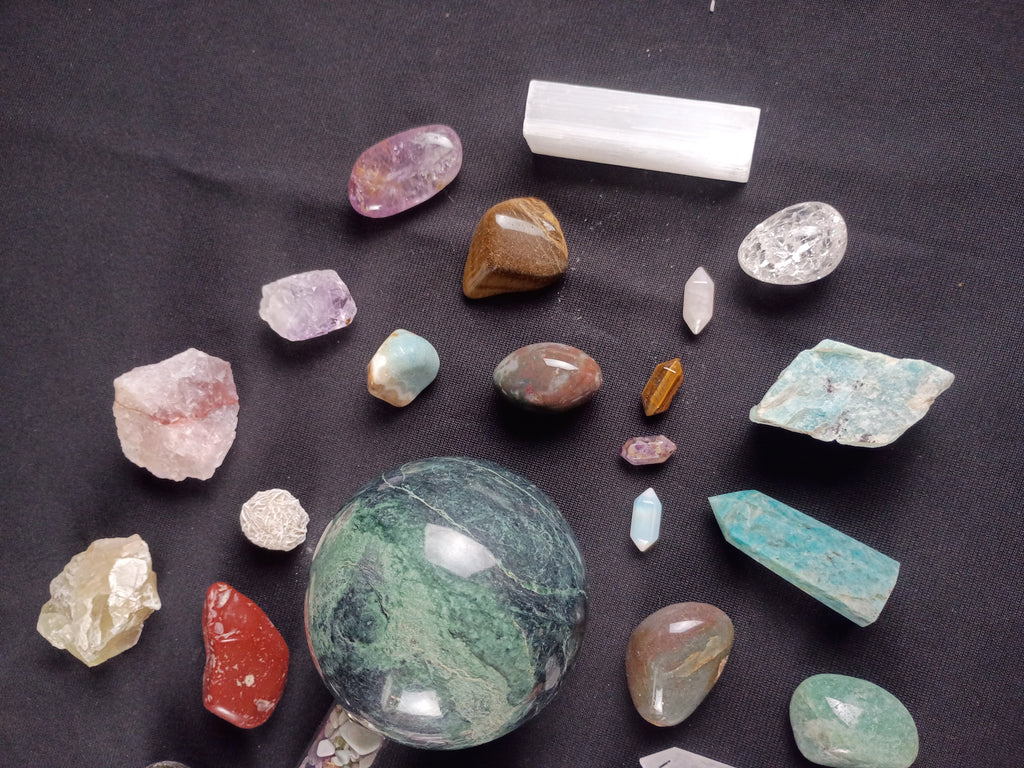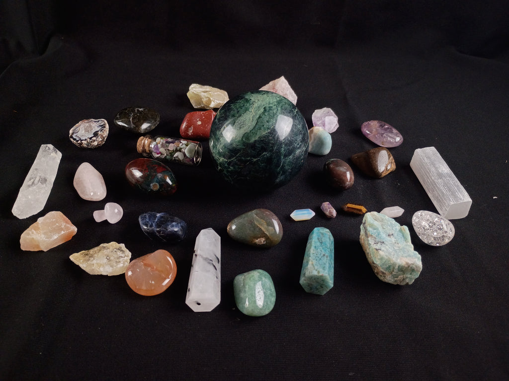 Mixed lot of 30+ beautiful Crystal specimens. Included are pieces of: Aventurine, Sodalite, Tiger’s eye, Calcite, Selenite, Agate, Amethyst, Jasper, Rose quartz, Labradorite, Amazonite and others. All in great condition ready for display.