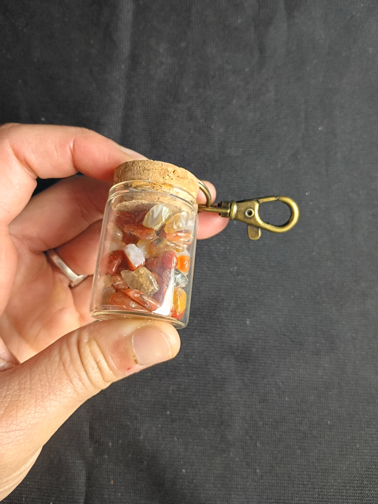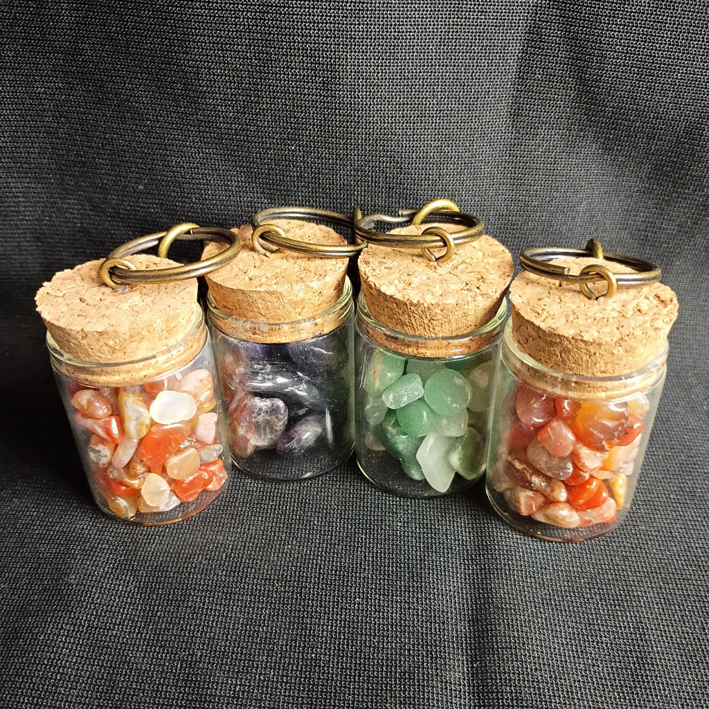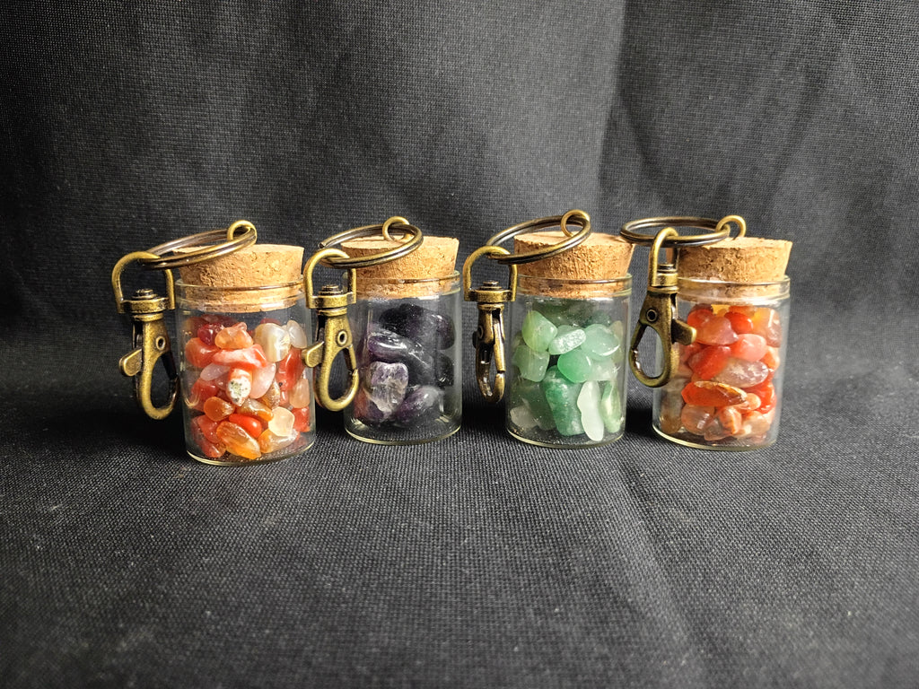 Four keychains. Glass bottles with small crystal specimen chips inside. Appears to be green fluorite, carnelian, and amethyst. In great condition!