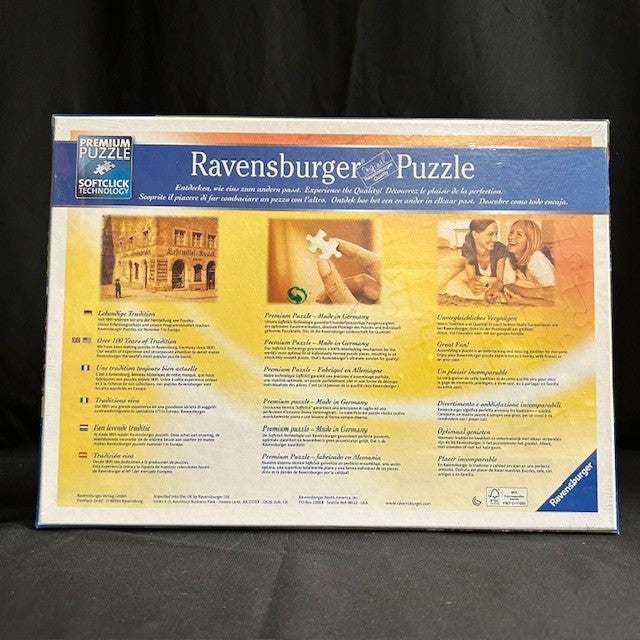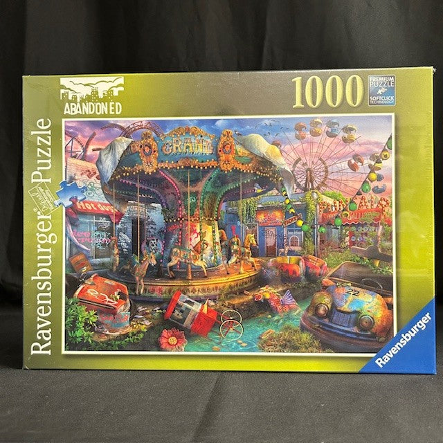 New in box puzzle from Ravensburger. 1000 Pieces outfitted with soft-click technology. This "Gloomy Carnival" illustration is from their "Abandoned" series. Measures appx 27.5" x 19.7" when complete. New!