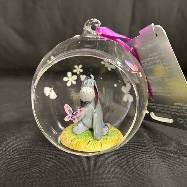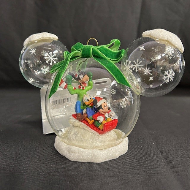 2 Disney ornaments that can grace your tree during the holiday season. One is a Mickey Mouse shape with Mickey, Pluto & Donald sledding. The other globe is "Winnie the Pooh" Eeyore with a butterfly! Perfect for your child to enjoy on the tree! Measurements for Mickey Mouse sled is7" W. by5.75" H./ Eeyore is 4.50" H. by 4.50" W.