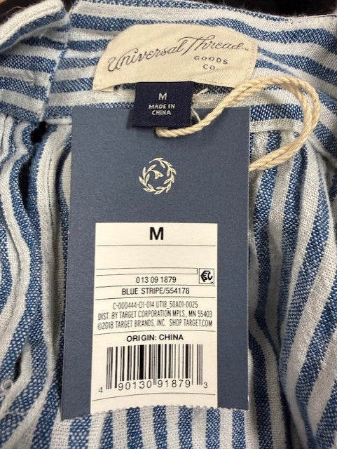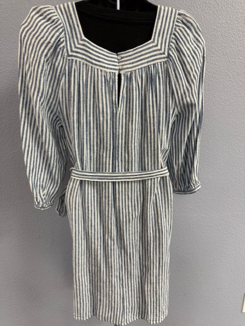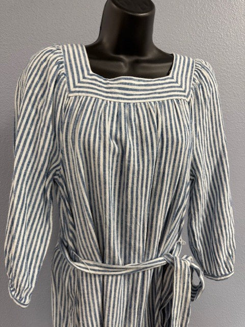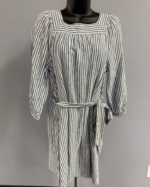 Brand new knee length blue and white striped cotton size medium dress with a square neckline, 3/4 length sleeves, and a matching sash.