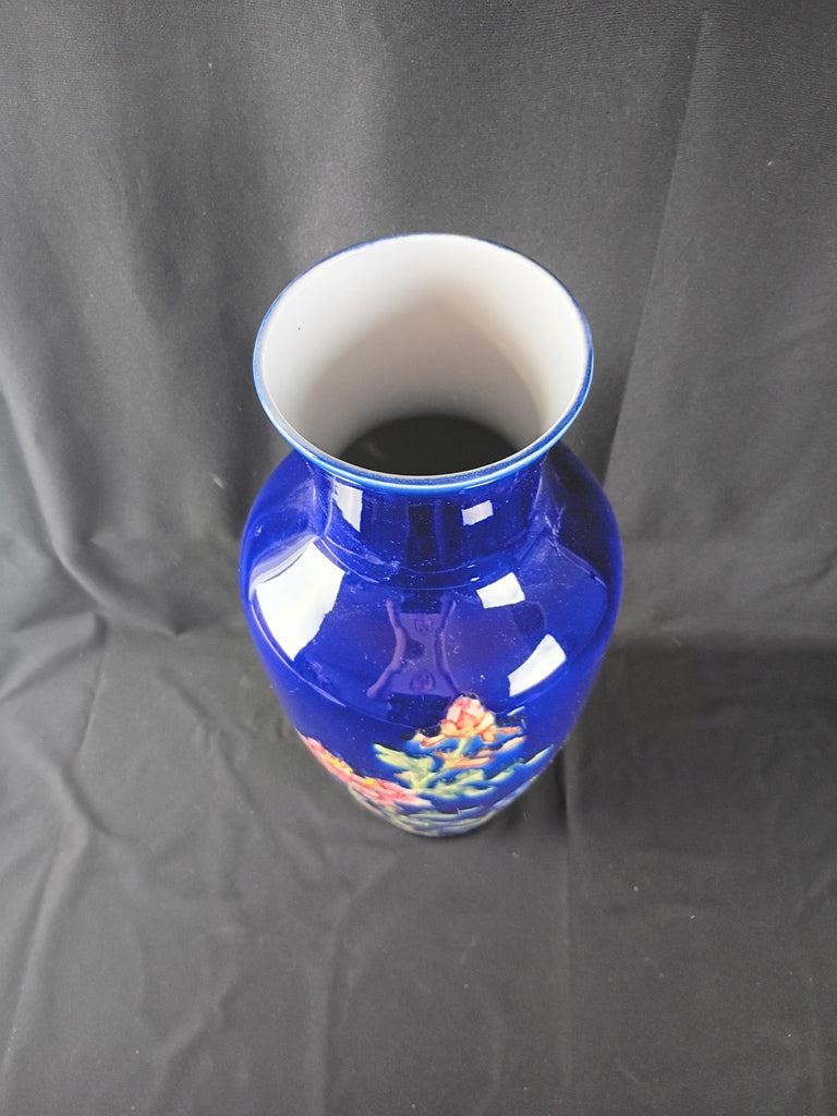 Cobalt Blue ceramic Vase from Taiwan. Glazed multicolor floral designs. In excellent condition. Measures 17"H x 8"W.