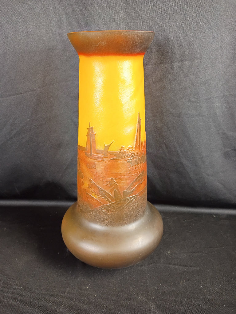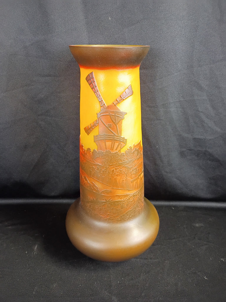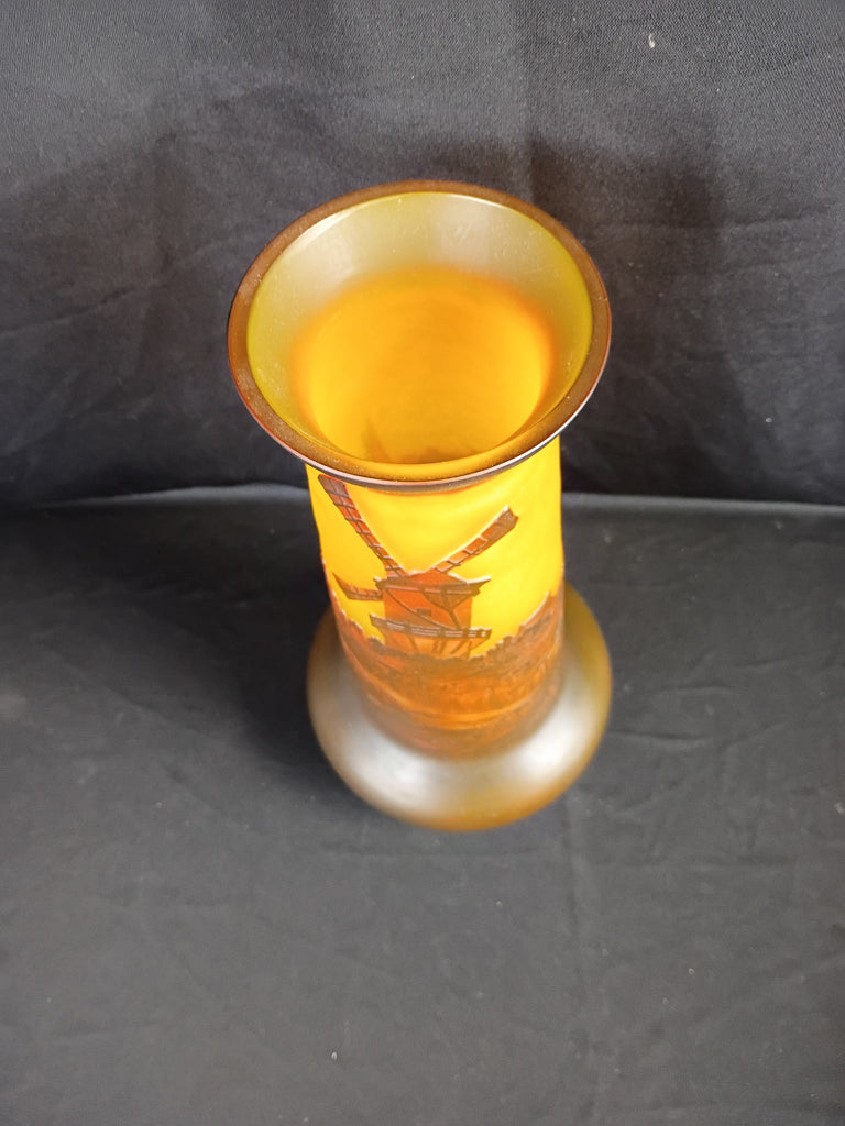 This beautiful vase features a windmill landscape, crafted in the French style by renowned glass artist Galle. 12" h x 6" wide at base and 4"w at the opening. In great condition.