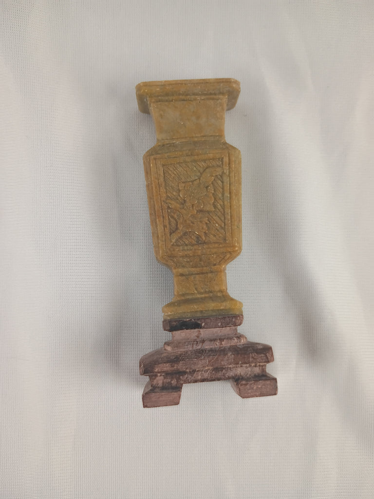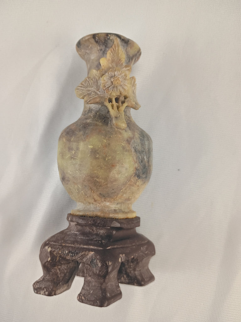 Three pieces of Chinese soapstone carvings, two are small vases and one is a landscape scene. Vases are 4 1/2" high and landscape scene is 4"long and 2" high. The square vase has a minimal chip on the top edge.