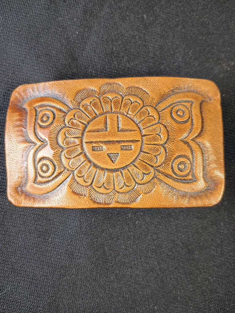 Tooled leather belt buckle. Sunface kachina design in the middle. In excellent condition. Measures 3"L x 2"H.