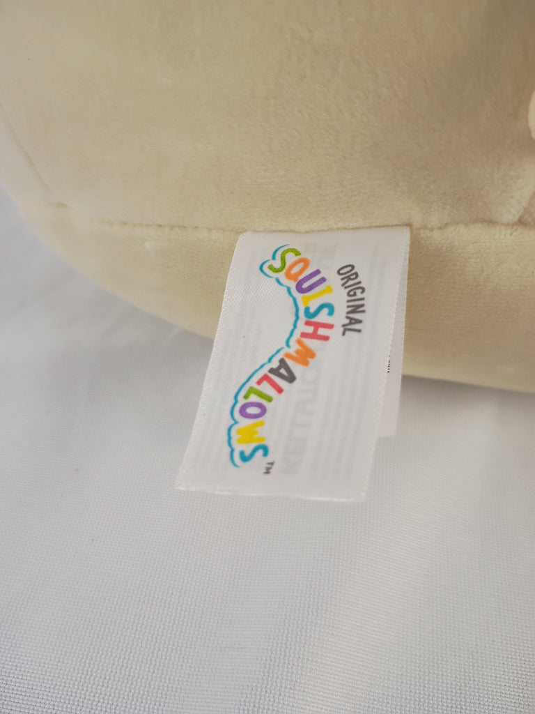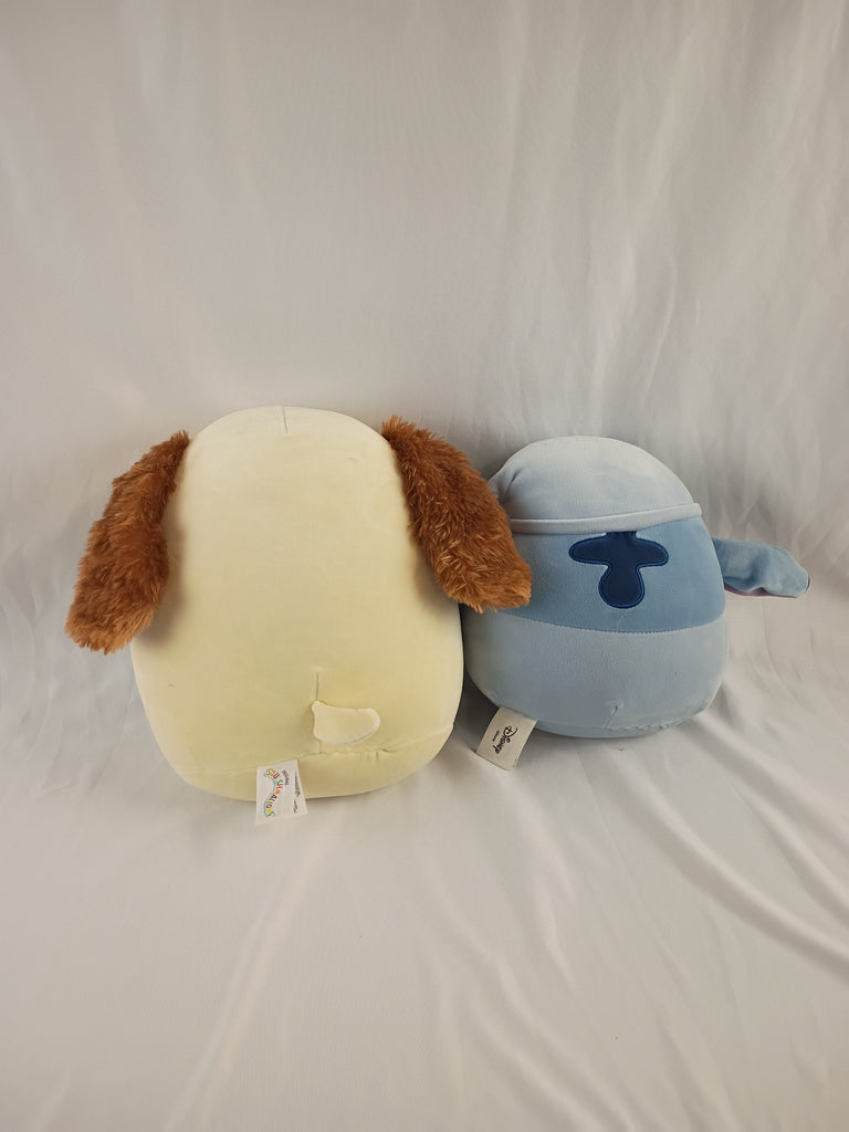 Two Squishmallows. One is a Stitch from Disney's Lilo and Stitch, the other is a brown and yellow puppy. Puppy is 9"H and lilo is 8"H.