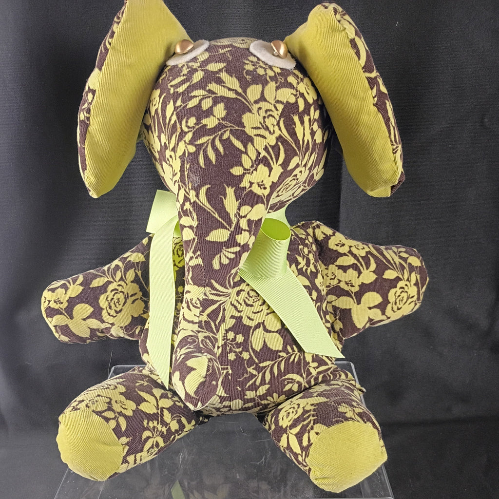 The Gaffe Jumbo elephant plush. Chocolate brown and chartreuse with gold eyes. Measures 9"L x 7"W x 19"H. Stuffed animal featuring vibrant floral yellow/green colors on a brown background In very good condition.