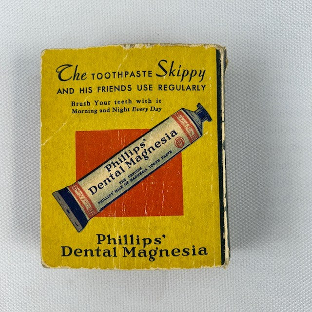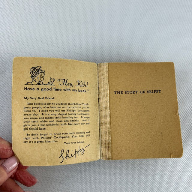 Small comic book from the 1930s. "The Story of Skippy". From "The Big Little Book" series. Follows a young boy and his misadventures. In very good condition, especially considering its age. Advertisement for Philips toothpaste on the back cover adds to this piece's vintage charm.