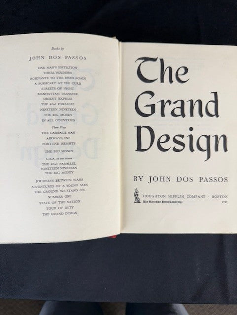 The Grand Design by Dos Passos. This 1949 novel critiques the expansion of federal bureaucracy and the shortcomings of FDR's New Deal policy during the Great Depression and World War II. In great condition.
