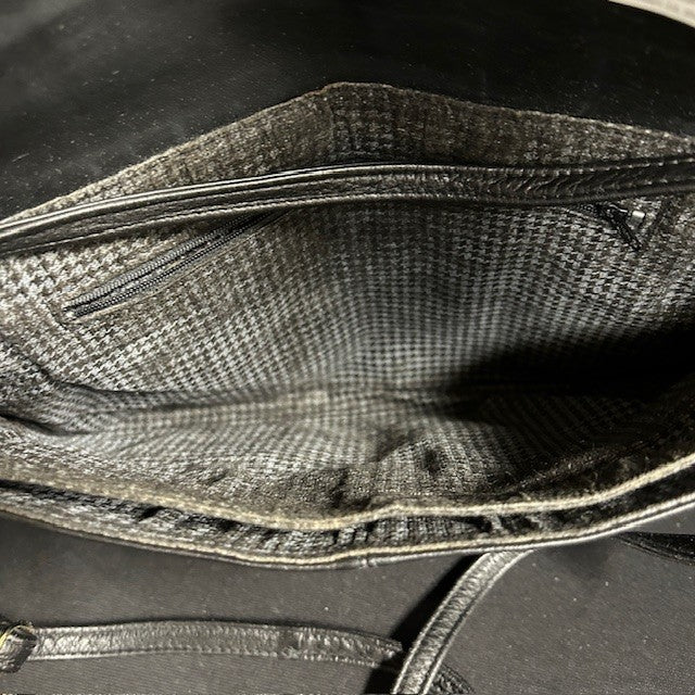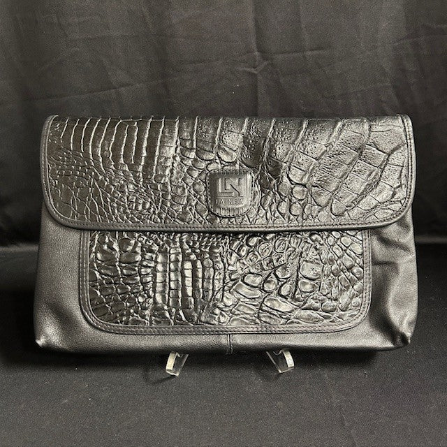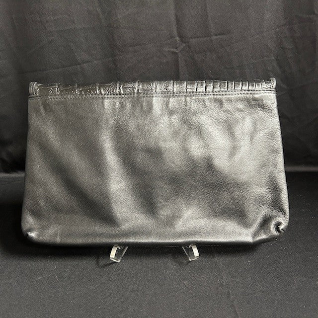 VTG 1980s supple black fold over clutch purse with optional shoulder strap in VG condition. Snap closure with 2 inside compartments and inside zip pocket and one external pocket. 14" W x 9" H.