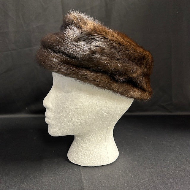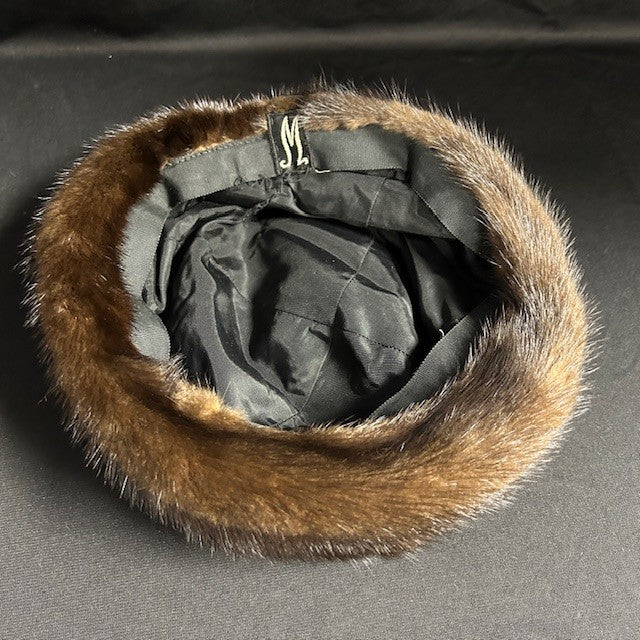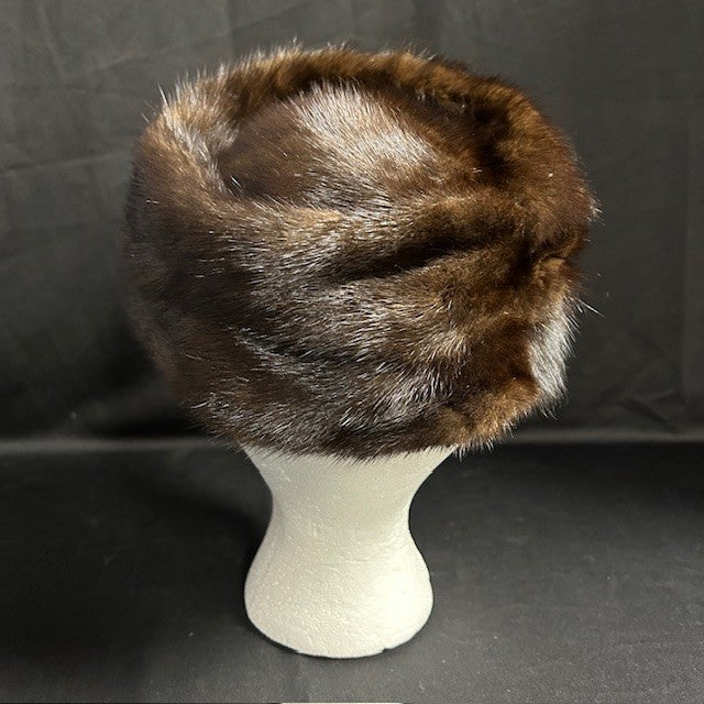 This real mink fur hat measures 8" across and should fit a m/l. Fur is ranch mink luxurious, shiny, classic pill box style.