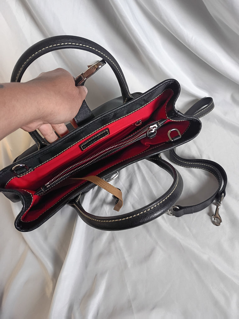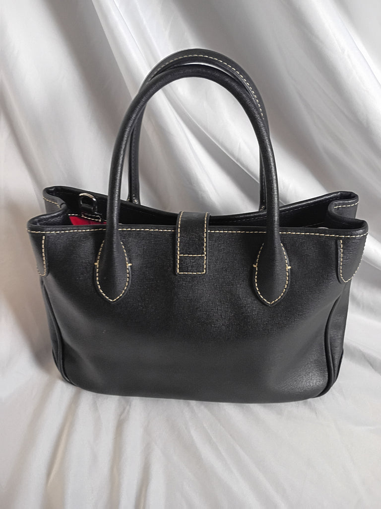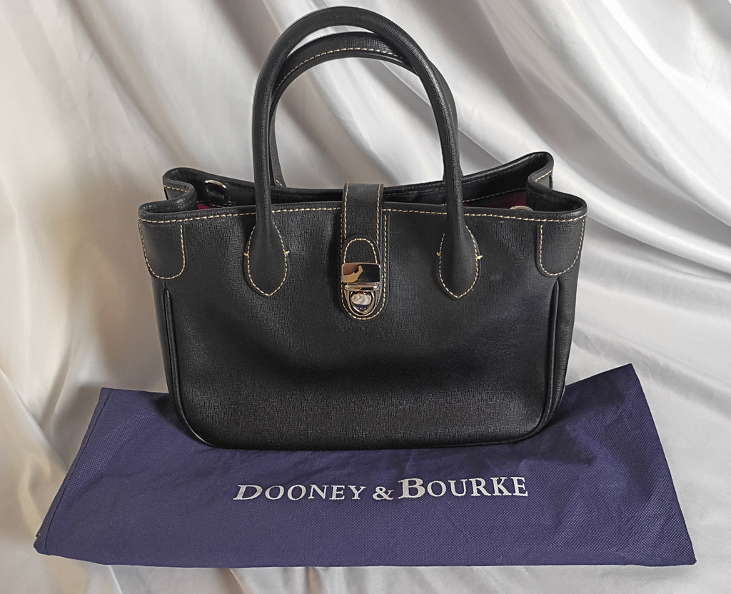 Beautiful Black crossgrain leather tote from the Dooney & Bourke Archives Collection; silhouette introduced in 2006. Two small stains in the interior, in otherwise excellent condition. Measures 12"L x 5"W x 8"H with a 5" handle drop, and 15" removeable strap drop. Three interior compartments: middle pocket has zipper closure. Four interior pockets. Push lock closure in the front. Comes with branded garment bag.