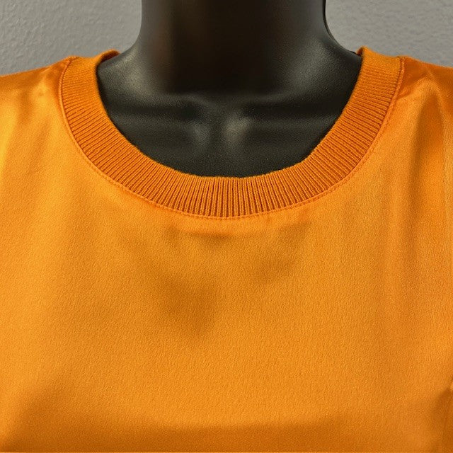 Great condition, shell rayon/nylon. Front part of blouse is nylon, where the back and edging on sleeves is viscose. Hand wash cold, lay flat to dry! Great piece for the summer, cool piece! Great with light or dark bottoms!