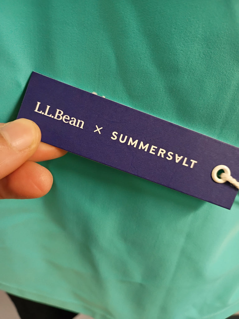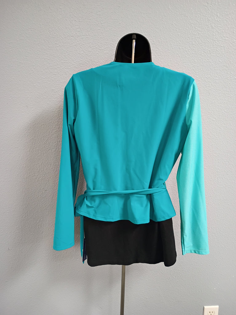 Two-tone blue wrap style top. Great piece to wear with shorts, pants or a swimsuit. Made of recycled materials. Hand wash cold, line dry. Size Large.