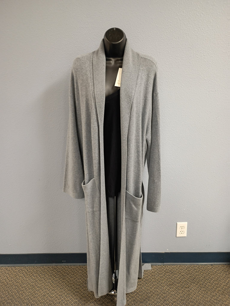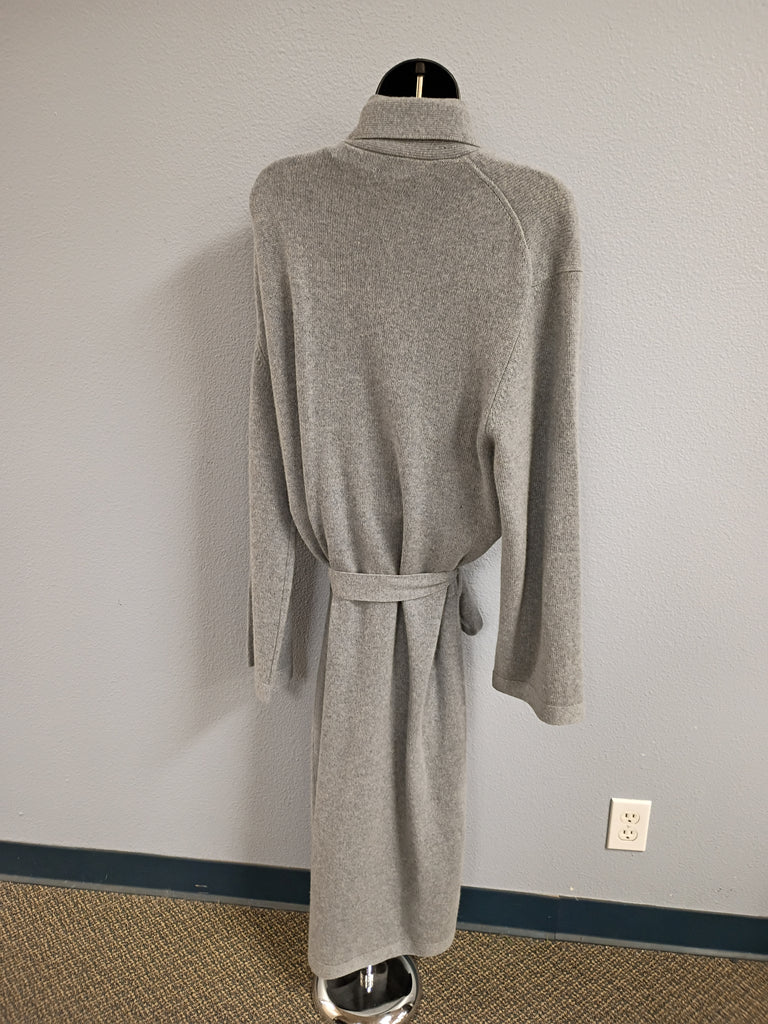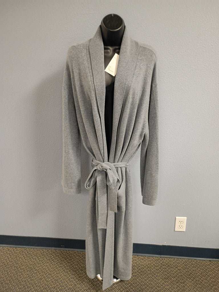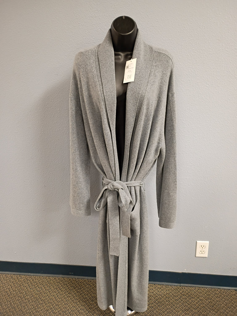 Brand new size large belted cashmere robe with two front pockets in a soft gray blue. Made by TSE Cashmere. New with tags.