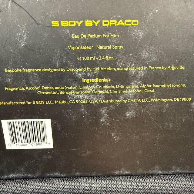 Luxury at its' best, a few sprays! 100ML/3.4 OZ. in original box. Lovely glass bottle of a natural spray for men. Will look good wherever placed. Manufactured in Malibu, distributed by Casta,LLC. Delaware. Measurements are 5.50" L. by 5.50" W.