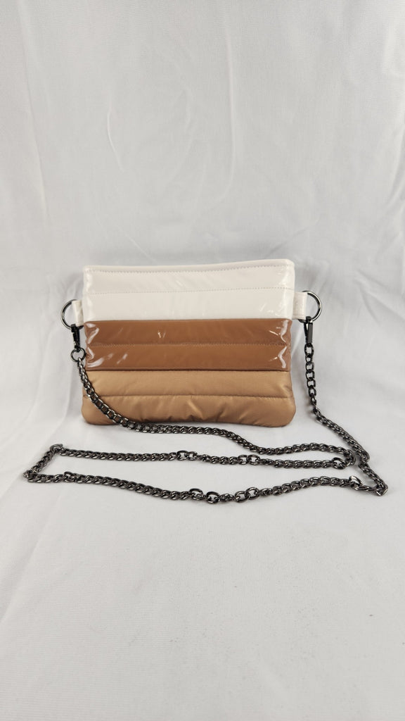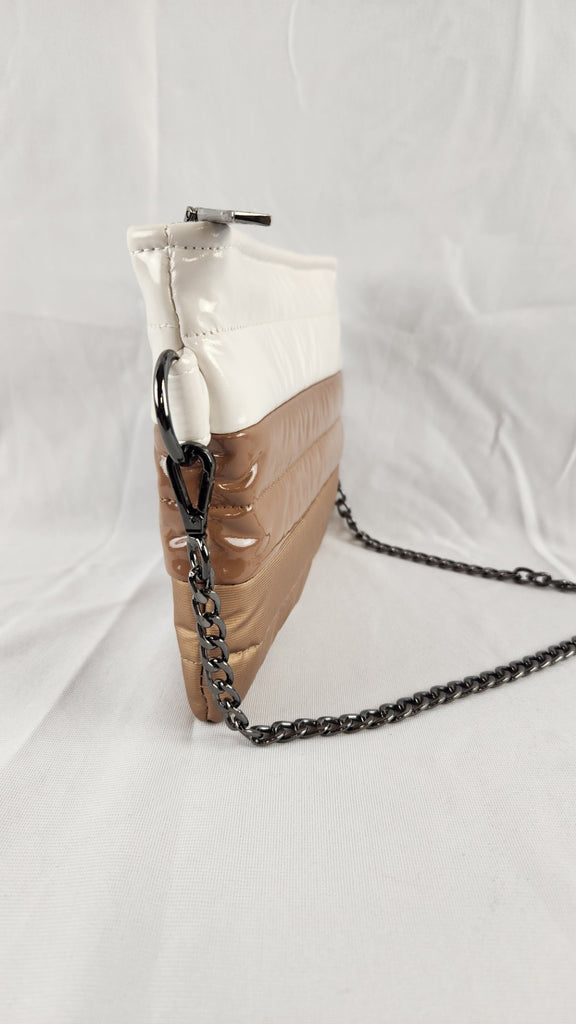Think Royln Crossbody bag in cream, cocoa and bronze tones with gunmetal chain. Measures 8.5"L x 6"H. In excellent condition.