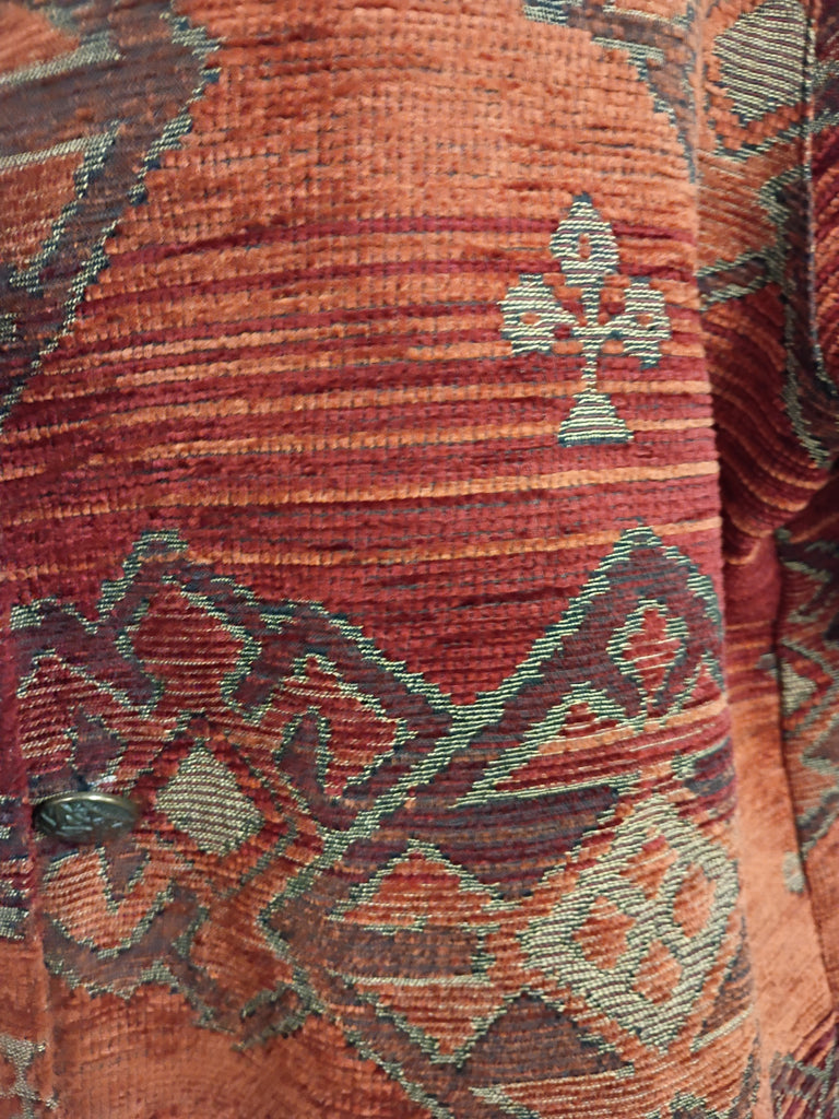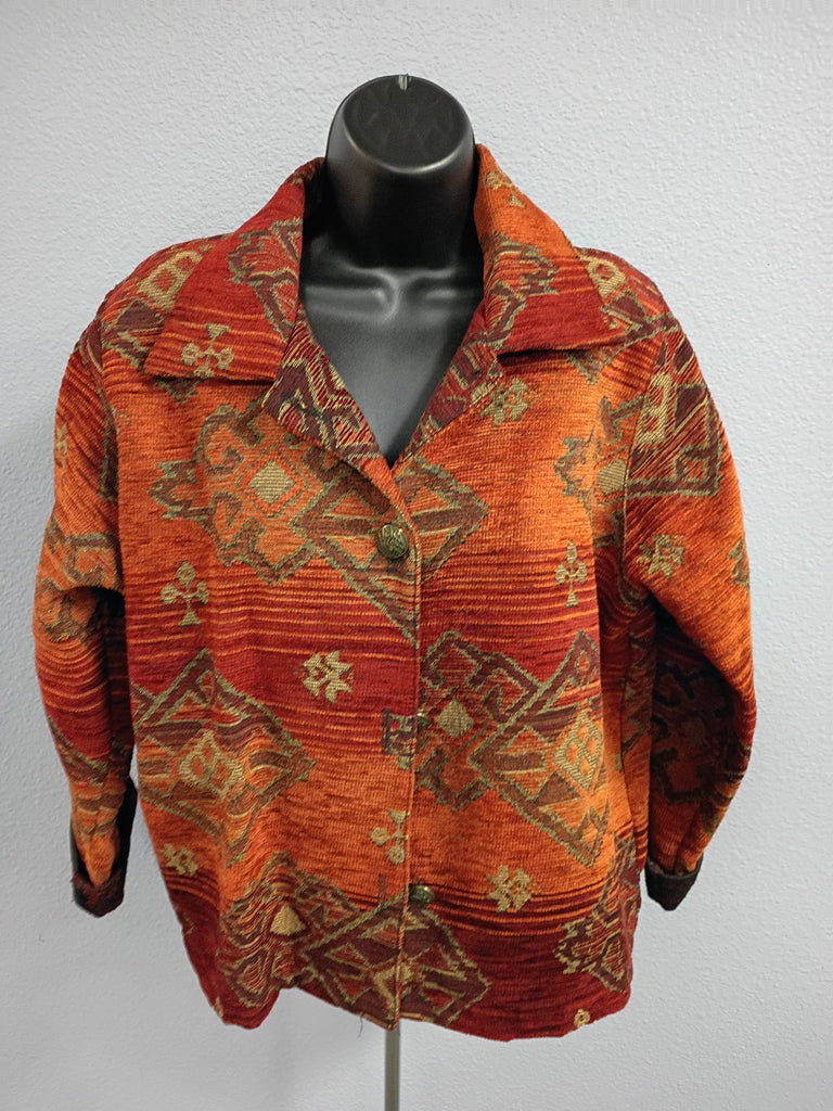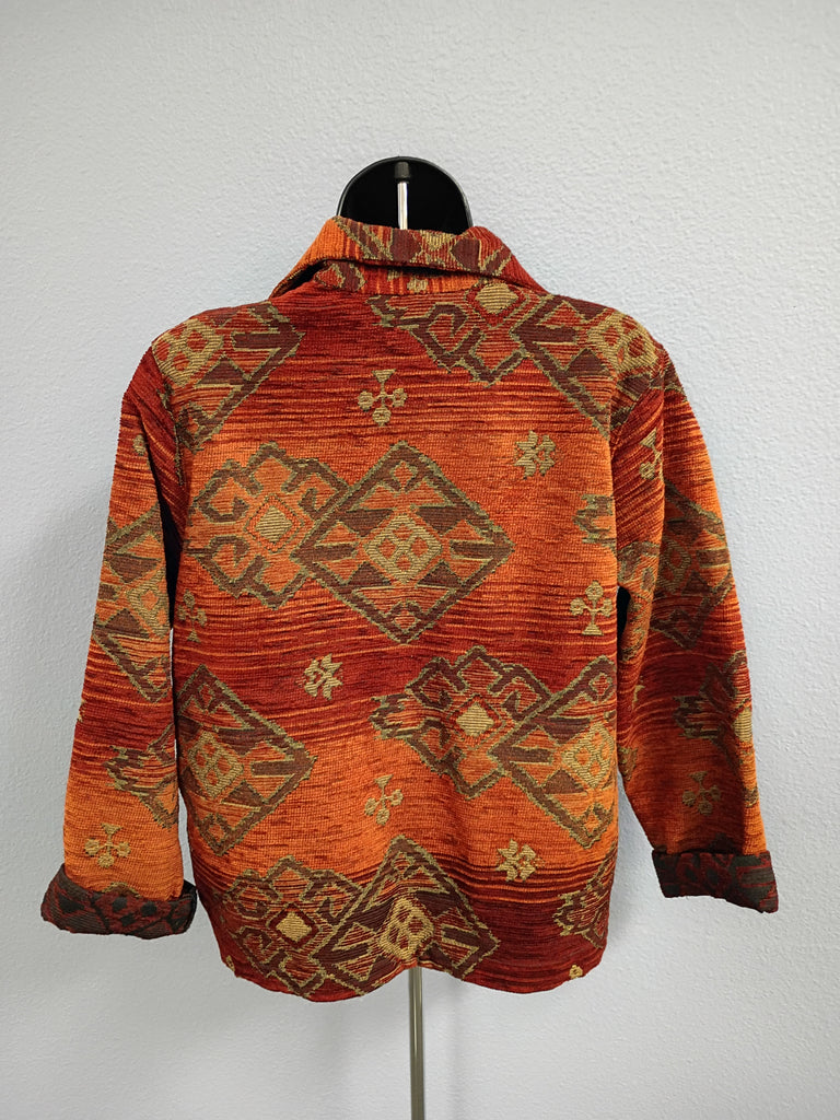 Norm Thompson tapestry jacket with southwestern motif print in shades of rust and orange. Size small. In excellent condition. Measures 21"L armpit to armpit 16 shoulder to shoulder 20.5 shoulder to hem.