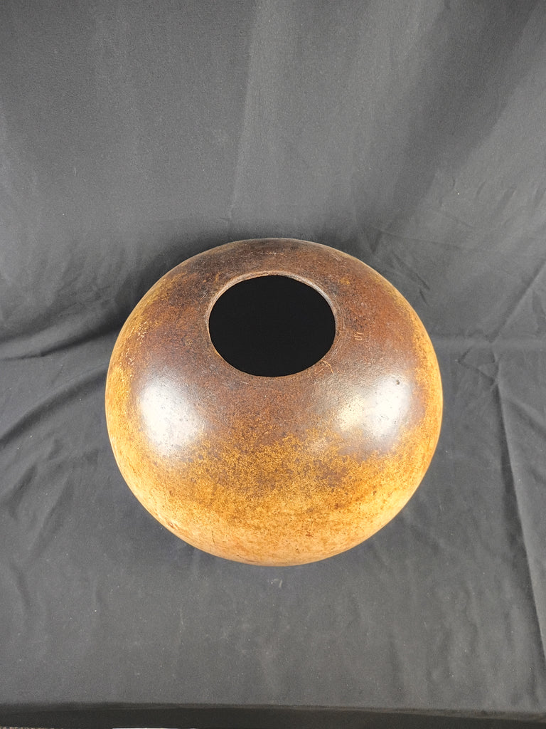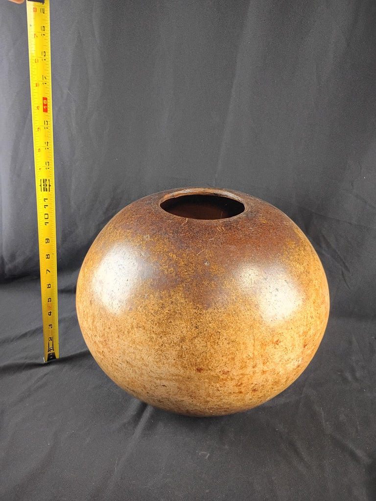 Large spherical 14"L x 12"H gourd shaped decorative clay vessel. Browns, tan and neutral colors. In great condition.
