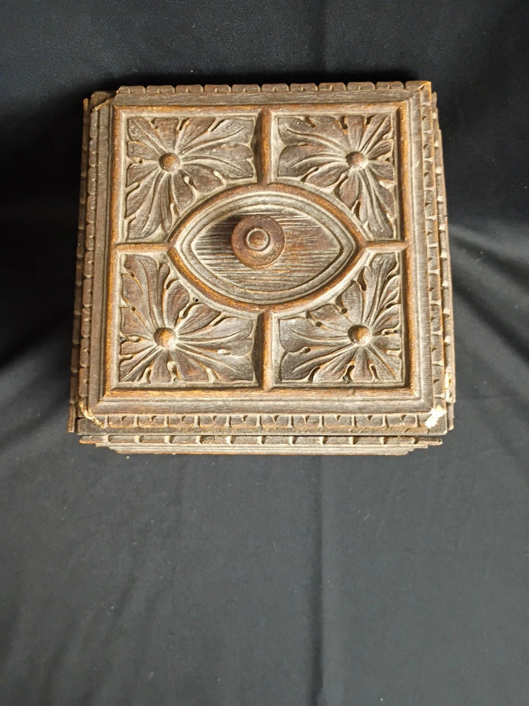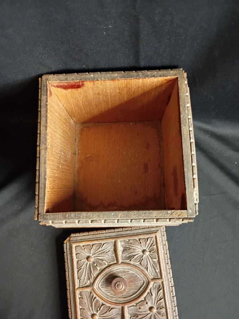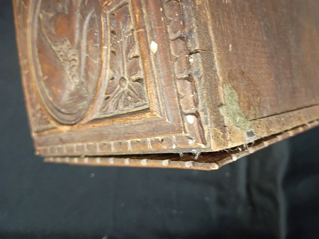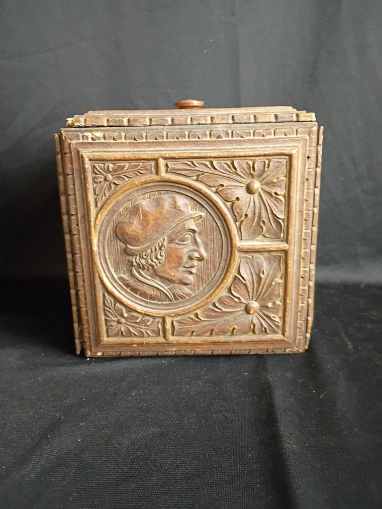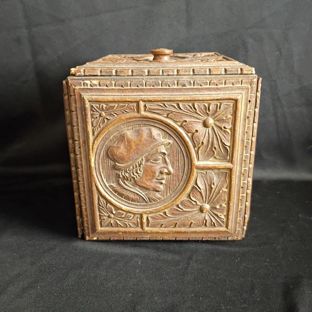 Antique tobacco humidor. Carved wood. Some chips in the wood (see photos) but in overall good condition. Cameo portraits on all sides of a Renaissance era male figure. Floral patterns throughout. Measures 8"H x 6.5"W x 6.5"D.