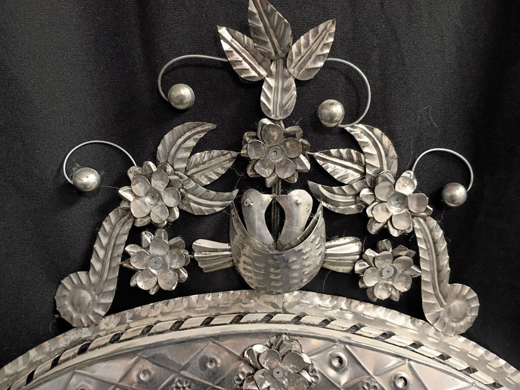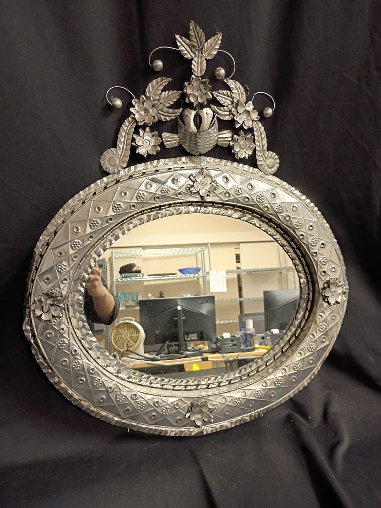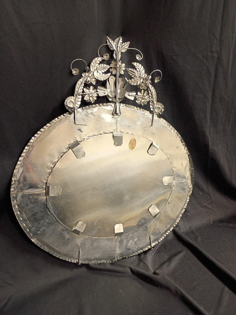 Artisan punched tin mirror hand made in Mexico. Bird detail at the top and floral details around the frame. In great condition. Measures 21"L x 24"H.