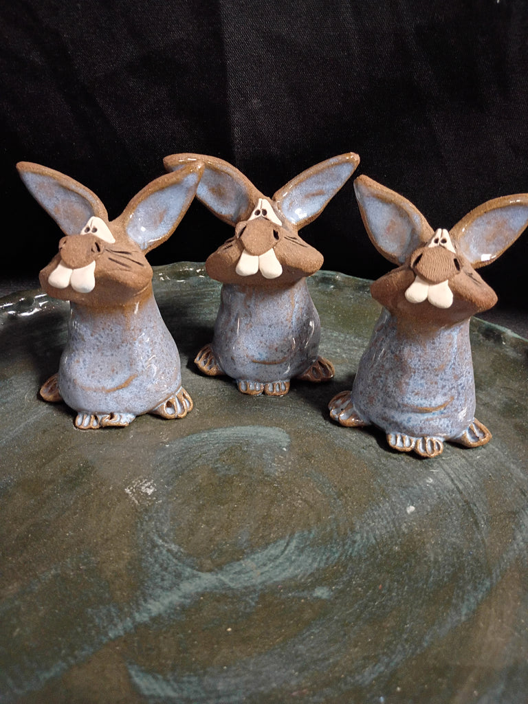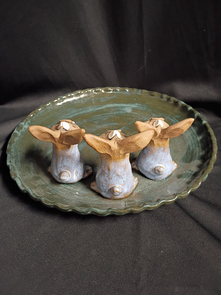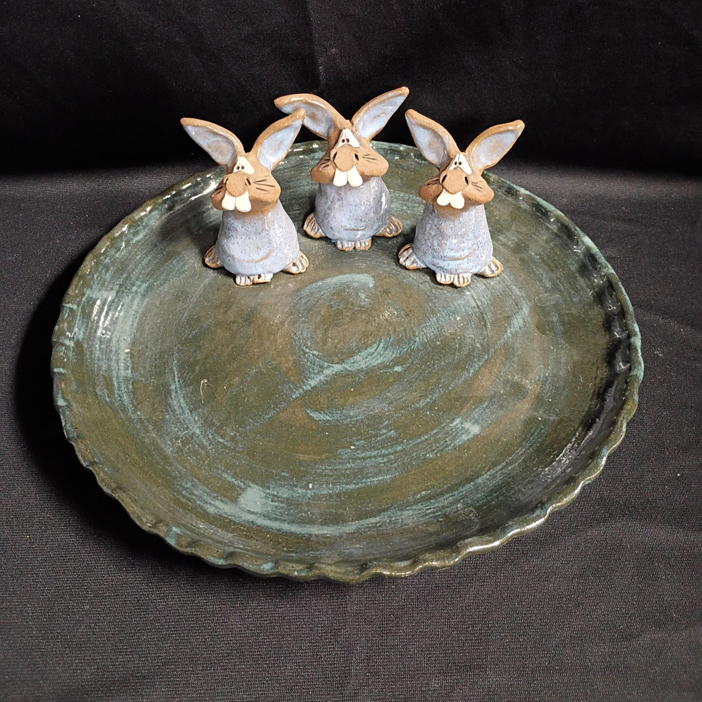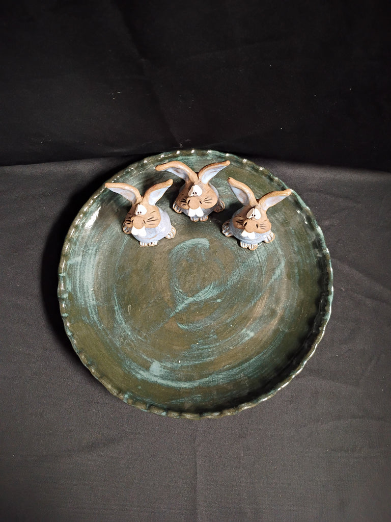 Whimsical art pottery piece in cool colors. Features three adorable cartoonish rabbits sitting on their hinds at the end of the plate. Dimensions: 11.75"W x 1"H, and the rabbits are 3.75"H. In excellent condition. Great conversation piece to serve hors dourves, or use as a decorative catch-all dish.