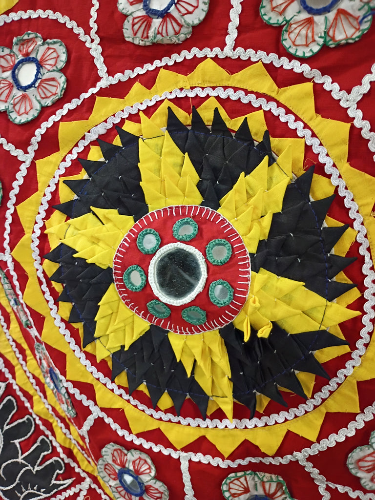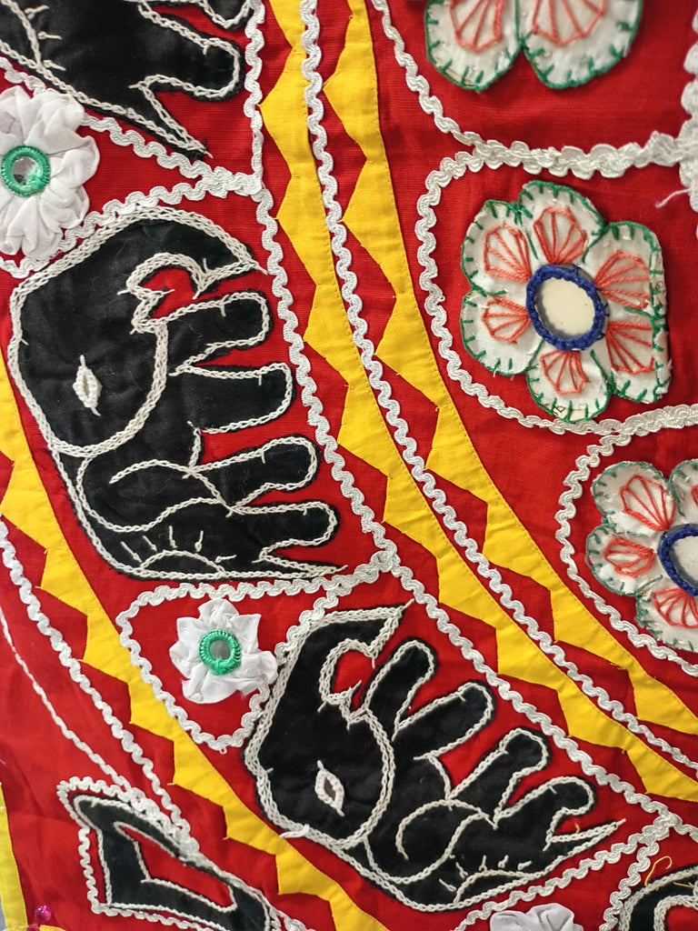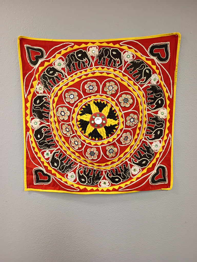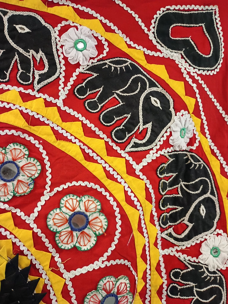 Indian folk art tapestry crafted using kantha sewing technique. Intricate embroidery and mirrors throughout. Design features Black elephants marching in a circle. In great condition. Measures 33" square.
