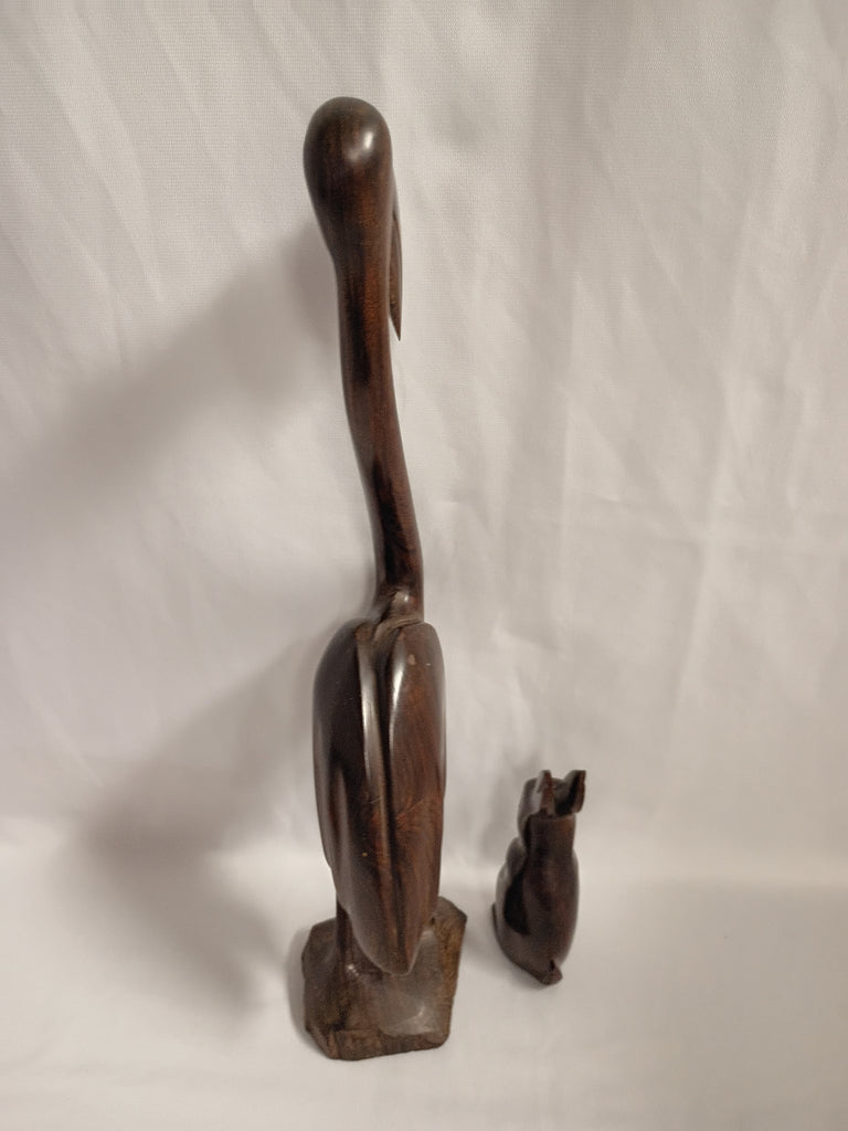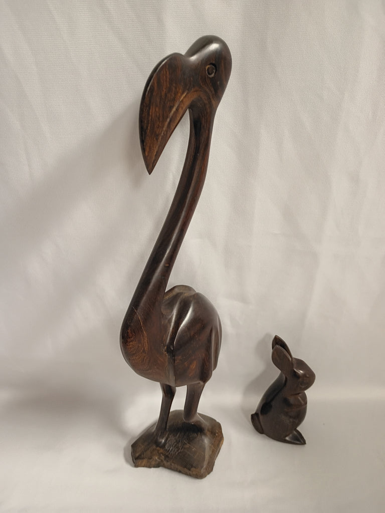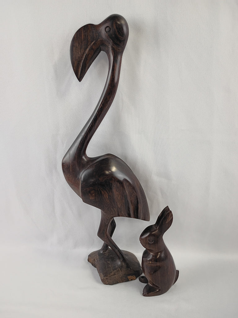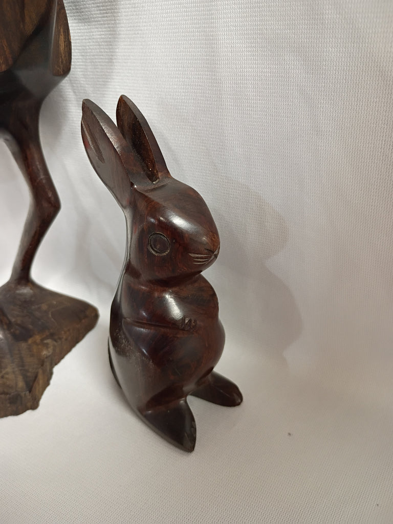 Hand carved wooden sculptures presumably crafted from Ironwood in Mexico. Bird measures 7 x 3 x 15, and rabbit measures 1.5 x 1.5 x 5. Both in great condition.