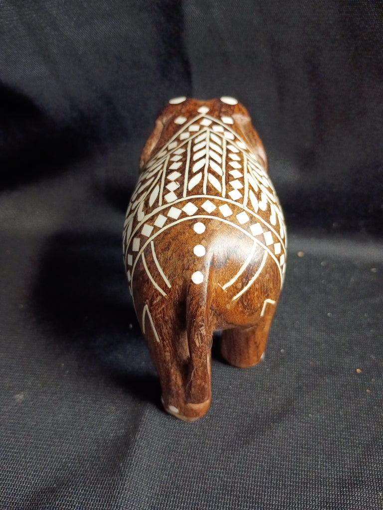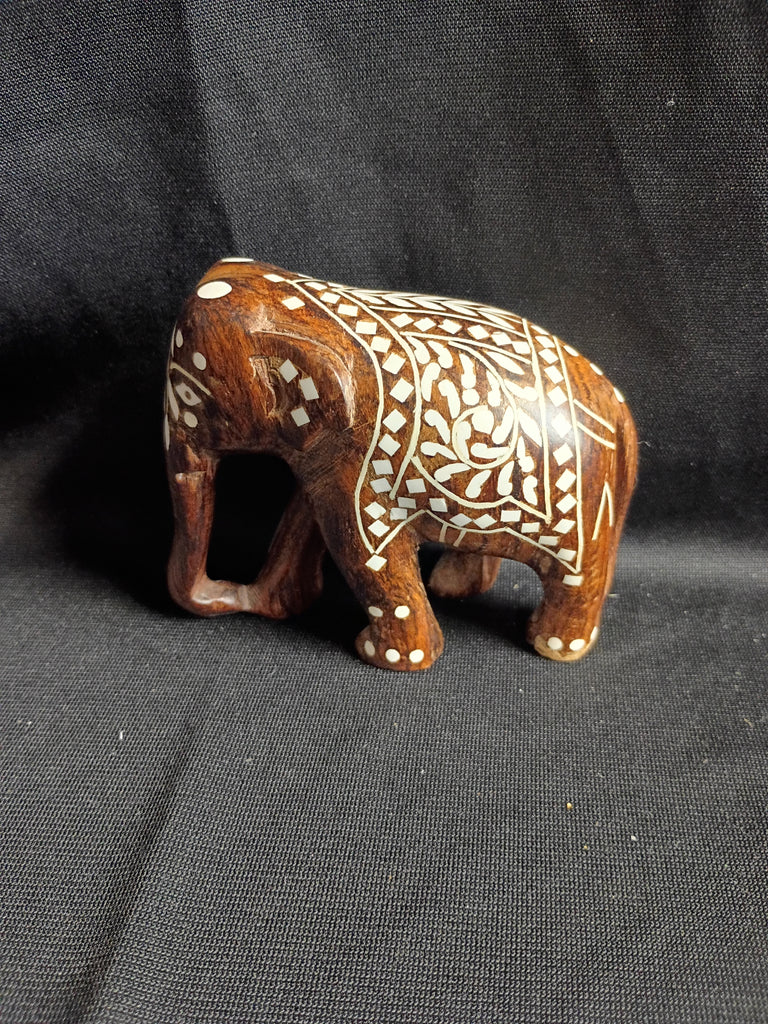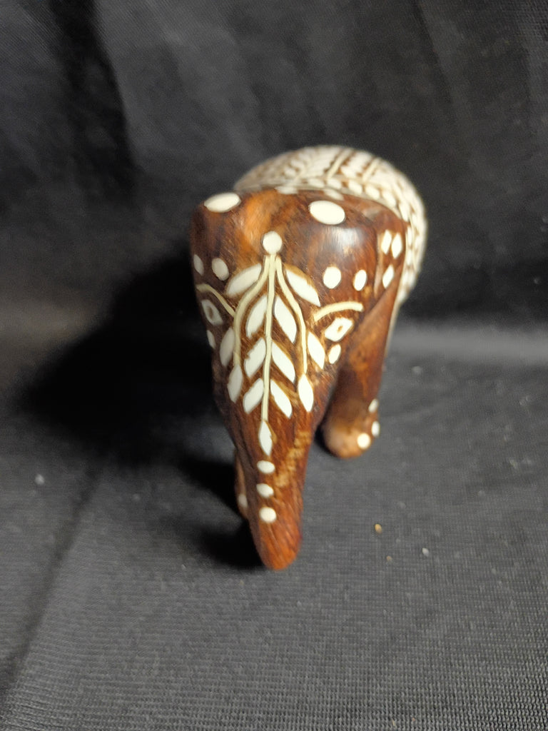 Hand carved wooden elephant with white inlay designs throughout. Likely from India. Measures 4"L x 2"W x 3"H. In excellent condition.