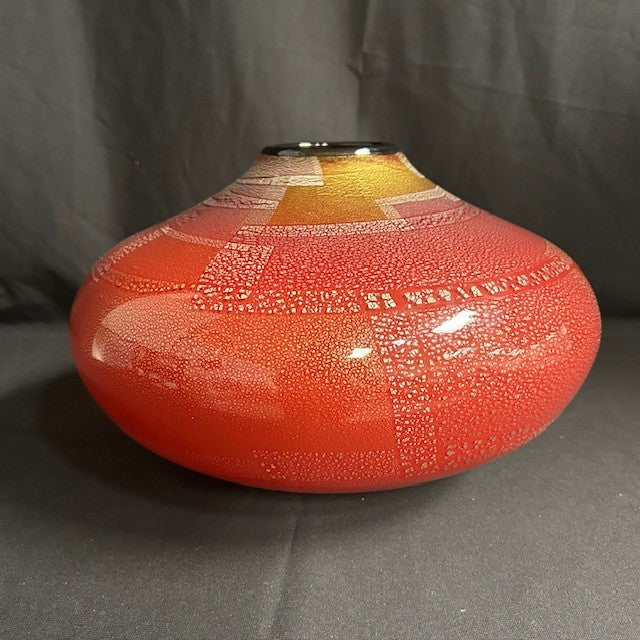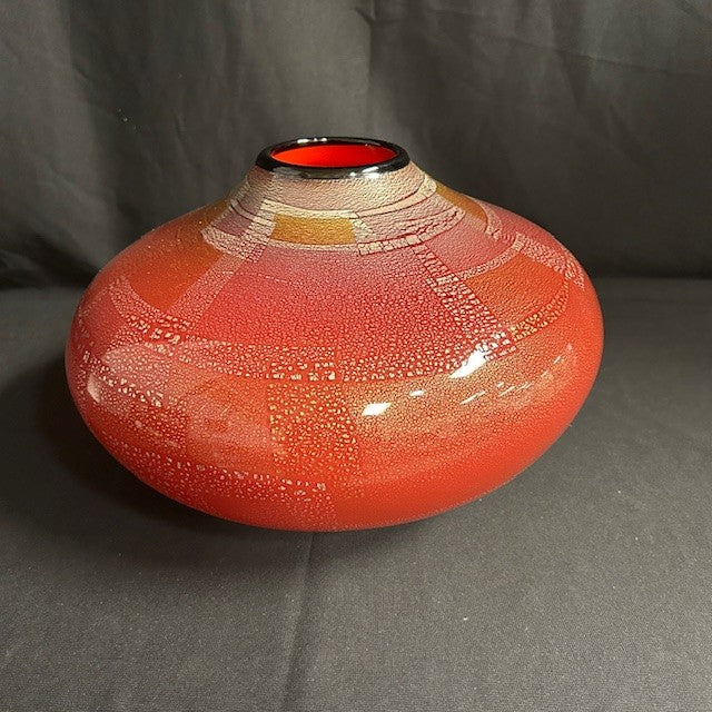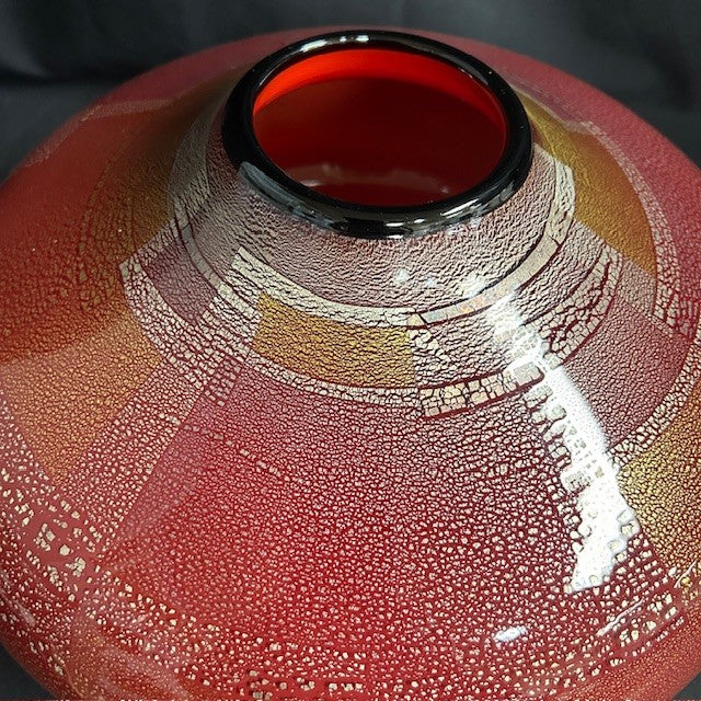Gorgeous huge crimson art glass vase with abstract metallic pebbled pattern in gold. Signed and dated. Measures 13"W x 8"H. In excellent condition.