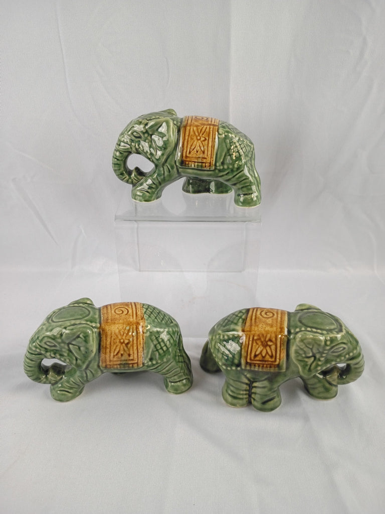 Lot of 3 Ceramic Elephants featuring a Green, and Gold-yellow glaze. Each measures: 6" l x 3 3/4" H. In perfect condition.