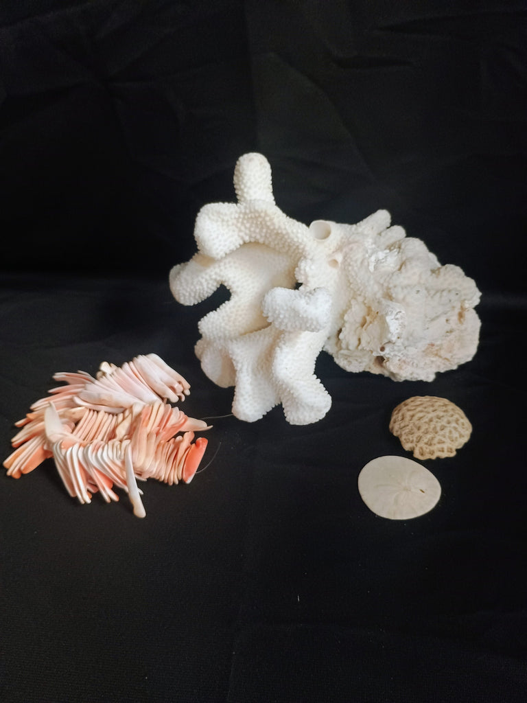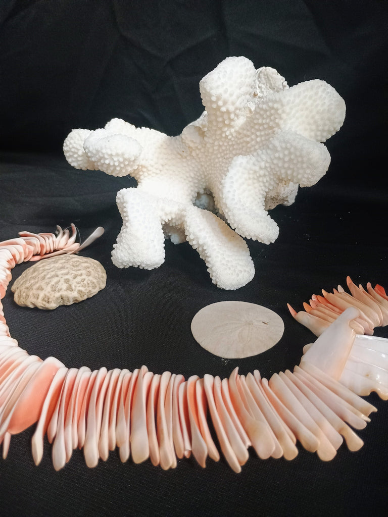 Lot of four unique sea specimens. One is a large white Cauliflower coral, sliced conch shell, a sand dollar, and and a star coral fossil. All in great shape. The sliced conch could be used to make jewelry as it is already strung. The largest piece measures 9"L x 7"W x 6"H, the smallest is 2"L x 2"W.