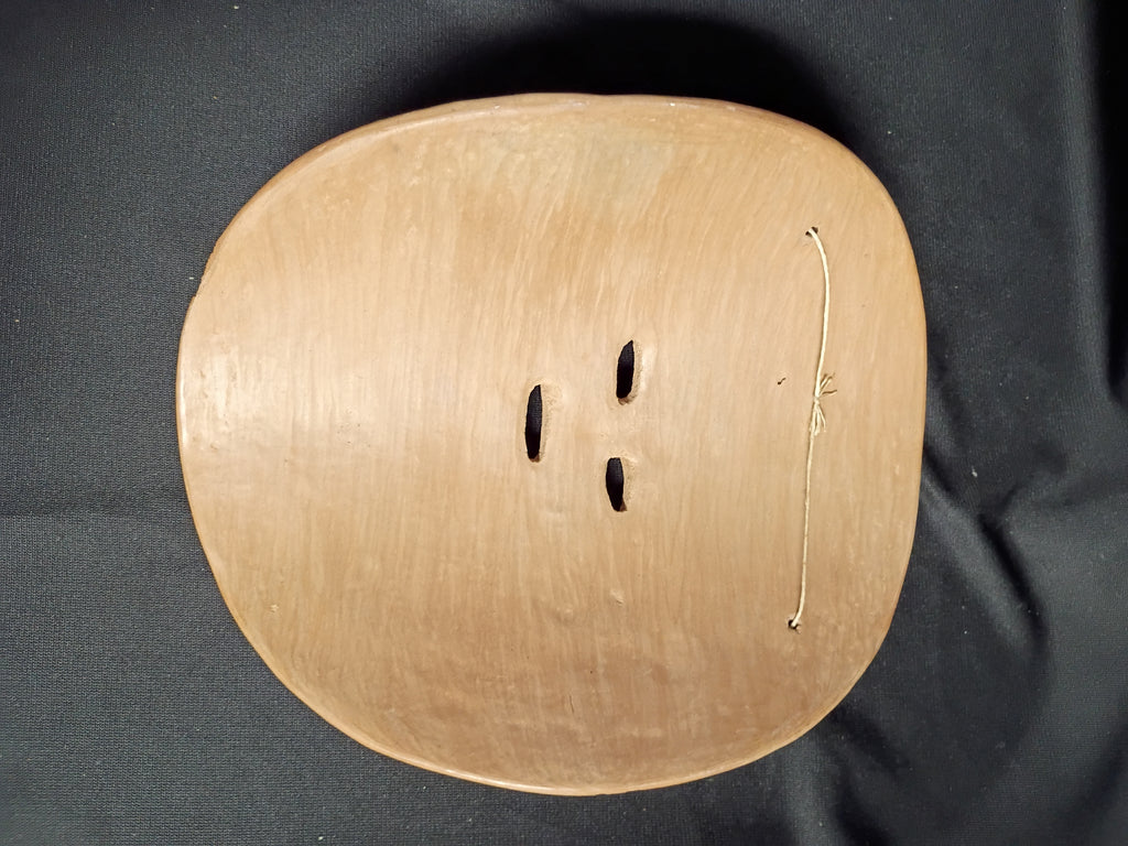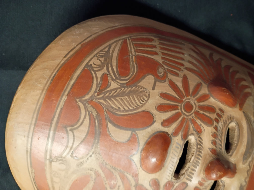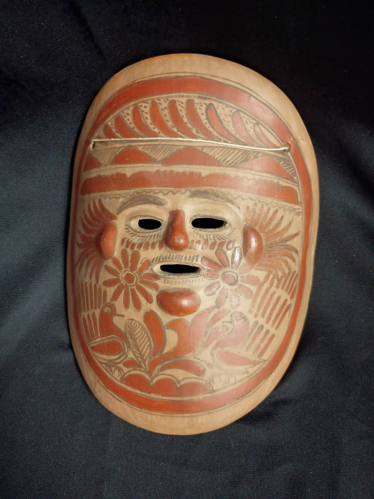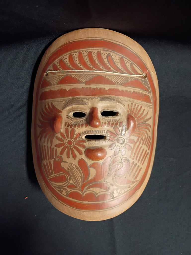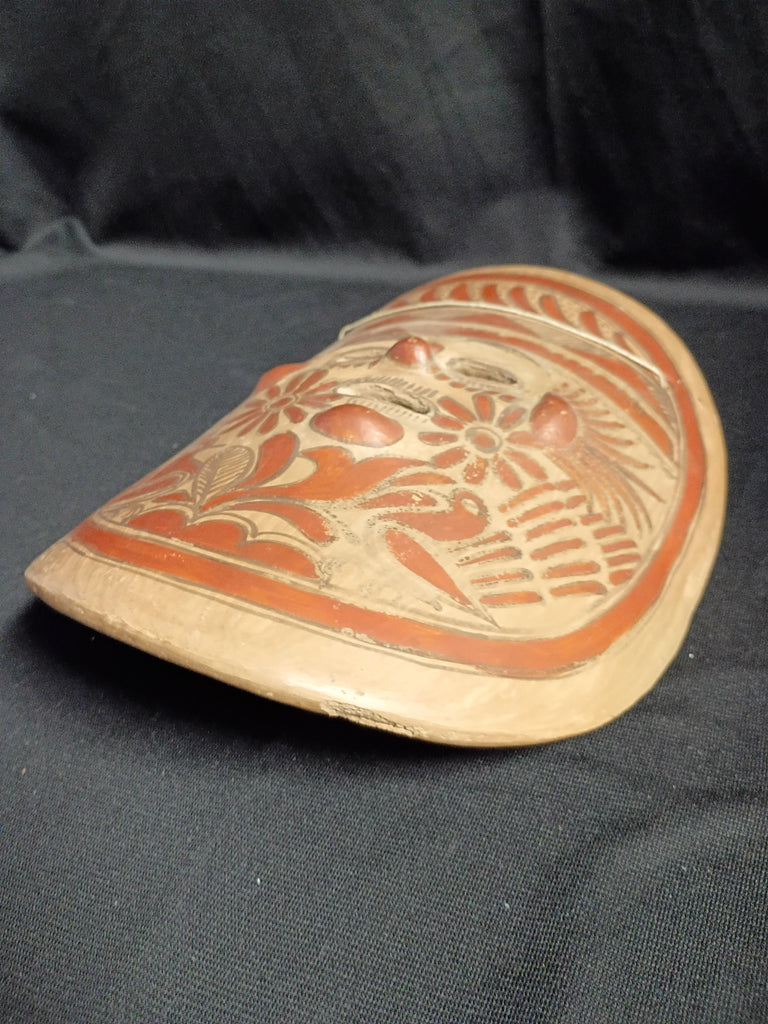 Terracotta mask with hand painted Tonala illustration. Made in mexico. Measures: 7" x 9". In excellent condition.