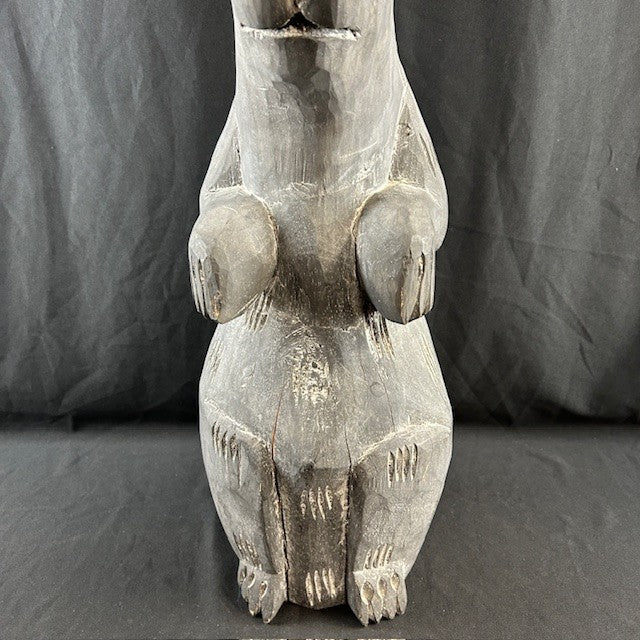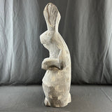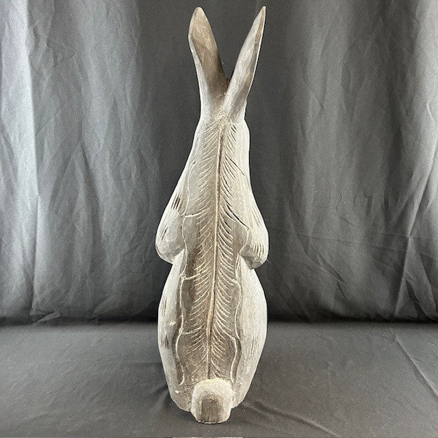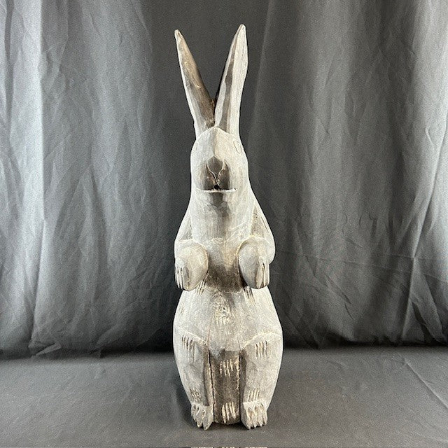 Large wooden hand crafted Rabbit statuette from Indonesia. Bunny is perched on his hinds with his ears perked. Measures 7"L x 6.5"W x 24"H. In great condition. Perfect to grace your indoor or outdoor spaces.