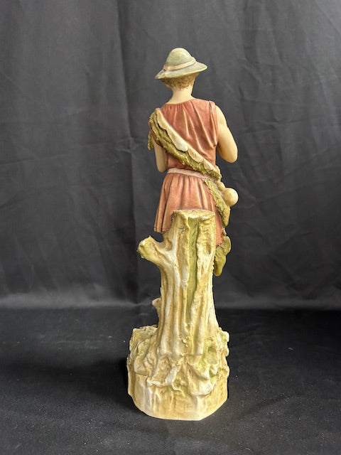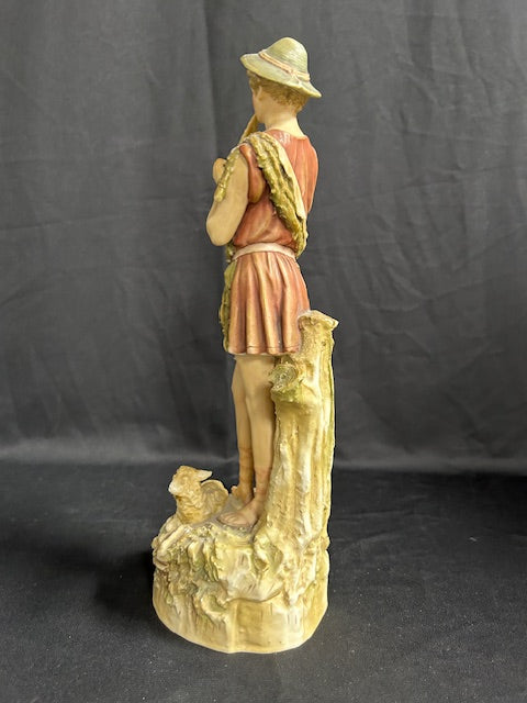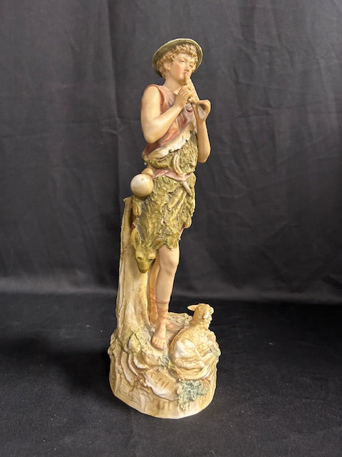 Very detailed Royal Dux shepherd boy playing a double flute with a sheep at his feet. There is a very small chip on the sheep's ear, otherwise in great condition especially for its age. Royal Dux stamped and numbered #351. Measures 12"H x 4"W.