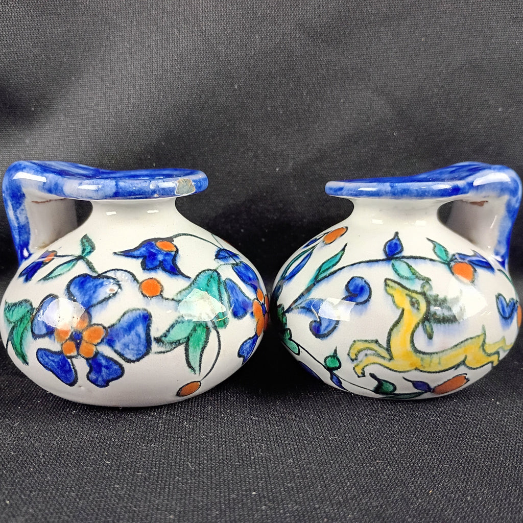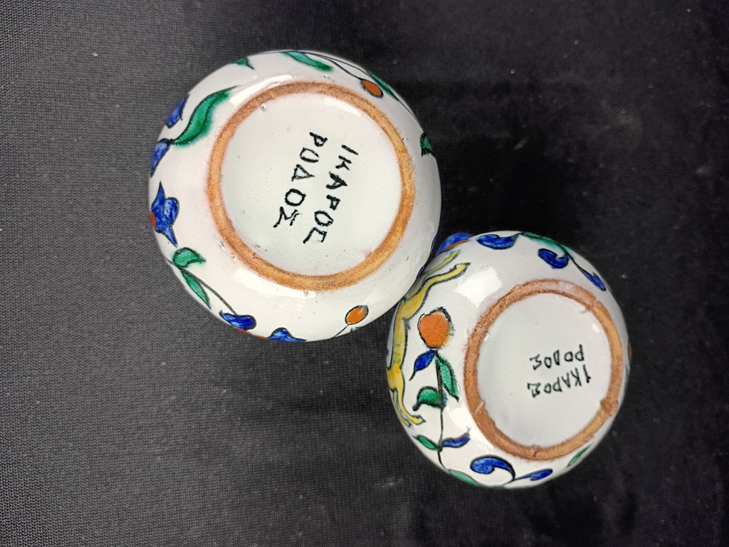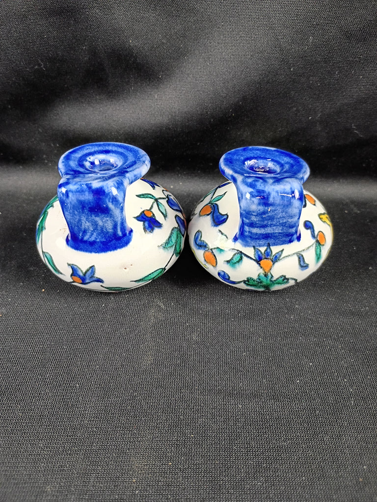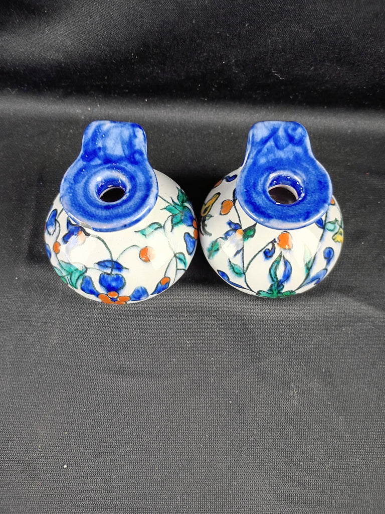 Set of two majolica pottery Greek candleholders. Each measures 2"H x 2 .5"W. Small chip on one of the rims, otherwise both in very good condition.