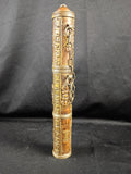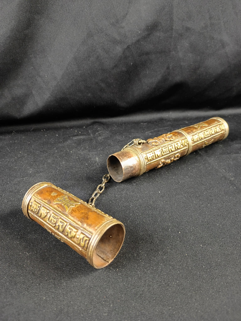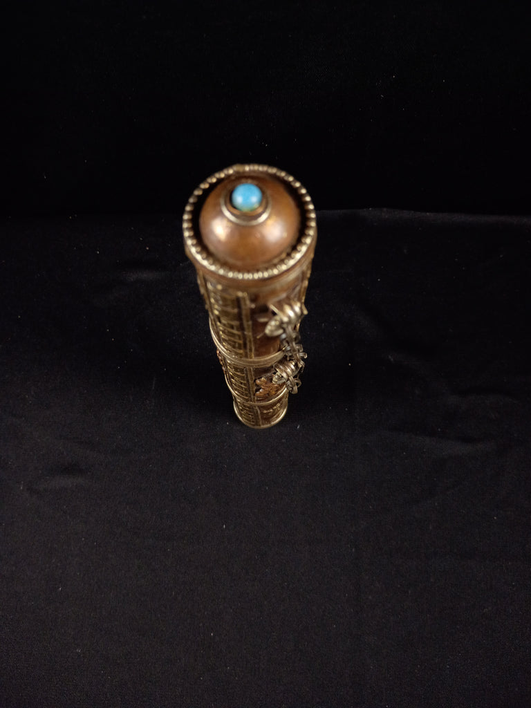 Tibetan brass repousse scroll case. Traditionally used for prayers. Lid has a small turquoise bead at the end. Measures 9" x 1"W. In excellent condition.