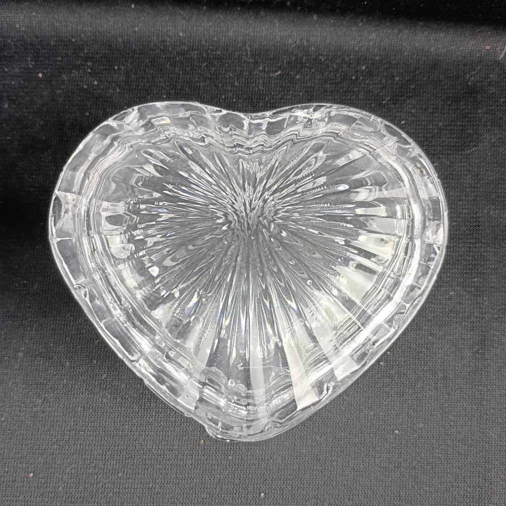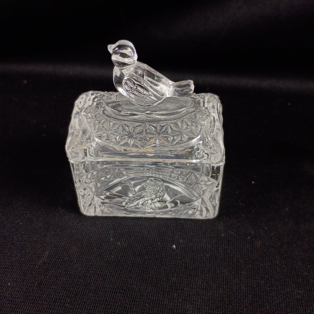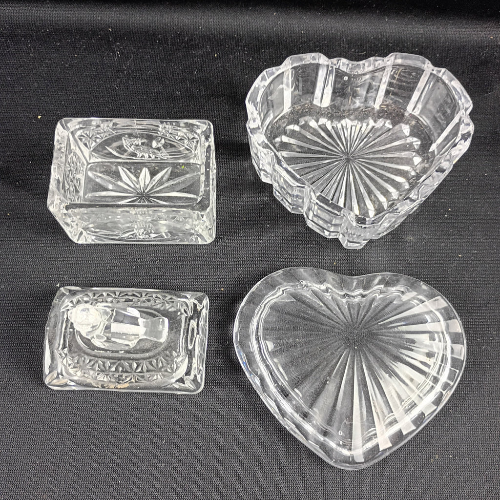 Two glass trinket boxes. One is chest style with a bird for the top handle, the other a heart shape. Bird measures 2.5"L x 1.5"W x 3"H, the heart is 3.5"L x 3"W x 1.5"H. Small chip under lid of heart box, otherwise both pieces in great condition.