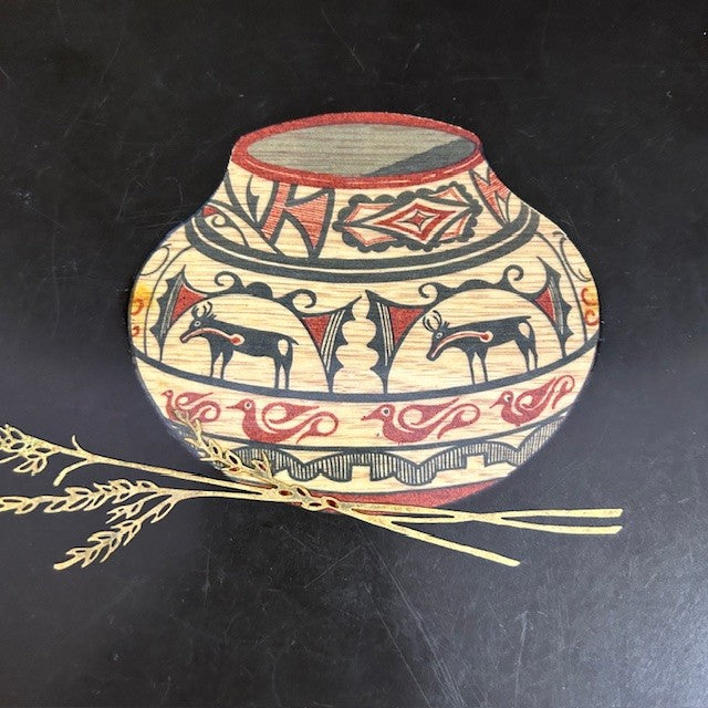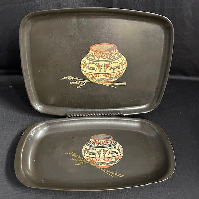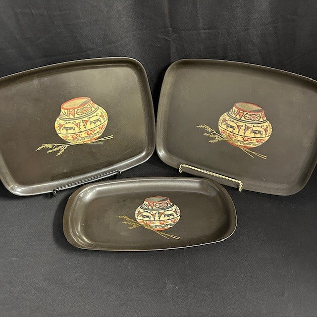 VTG Couroc Tray Set; Native American basketry motif with wheat sprigs. Larger trays measure 12"L x 9.5"W and smaller tray is 12.5"L x 6.75"W. All in very good condition.