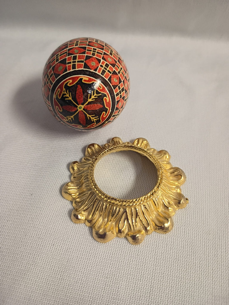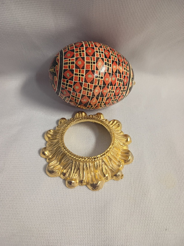 Traditional Ukrainian hand decorated egg with gold colored metal stand. Measures 2.5"H. In excellent condition.