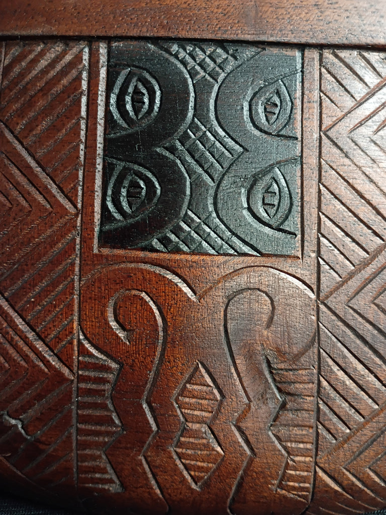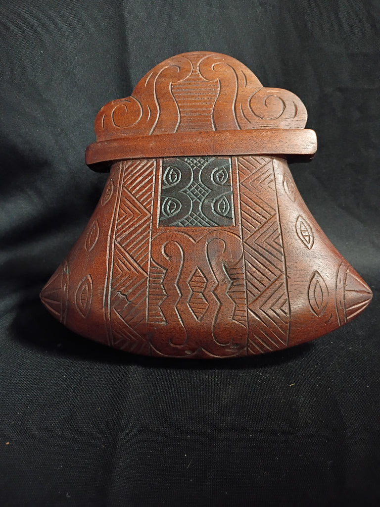 Carved wooden sculpture. Appears to be an Ulu knife or a bell. Culture and date unknown. Measures 7.5"H x 7"W. Small staple sticking out the back but in otherwise excellent condition. Mysterious and intriguing piece!