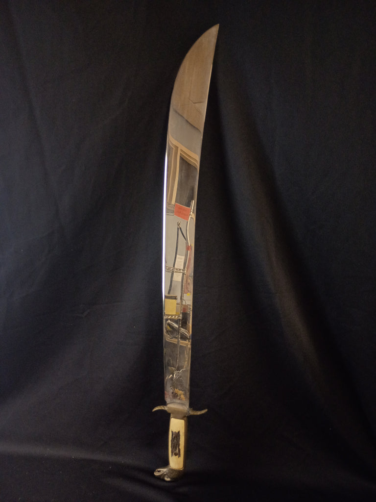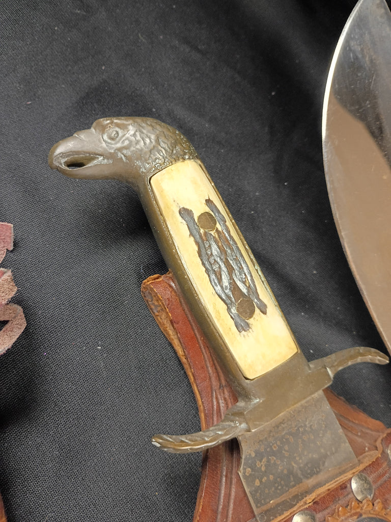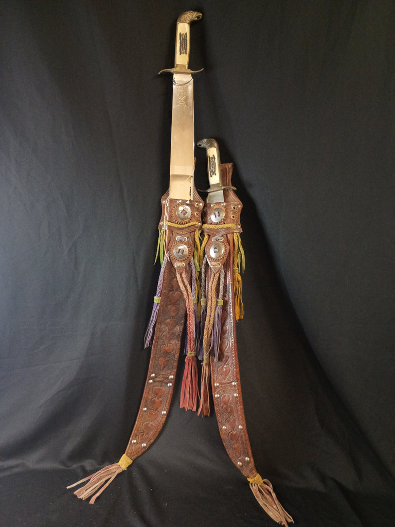 Vintage pair of machetes from El Salvador. Both come with ornate leather sheaths. Sword handles have bone inlay and brass eagle heads at the end. In great condition. Each measures 30"L x 3"W (in sheath).