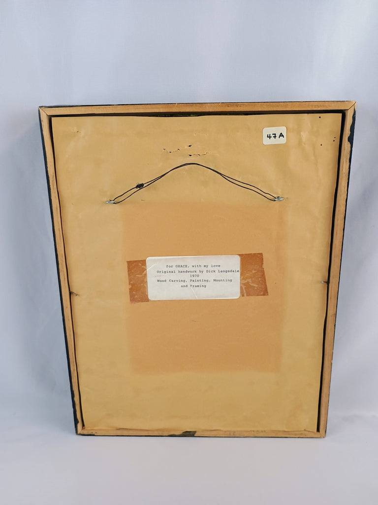 Framed folk art depiction of the holy family: Joseph, Mary, and Baby Jesus. This is an original painted carving by Richard "Dick" Langsdale and is signed by the artist. Measures 12"H x 2"W x 15"H. Unique piece.